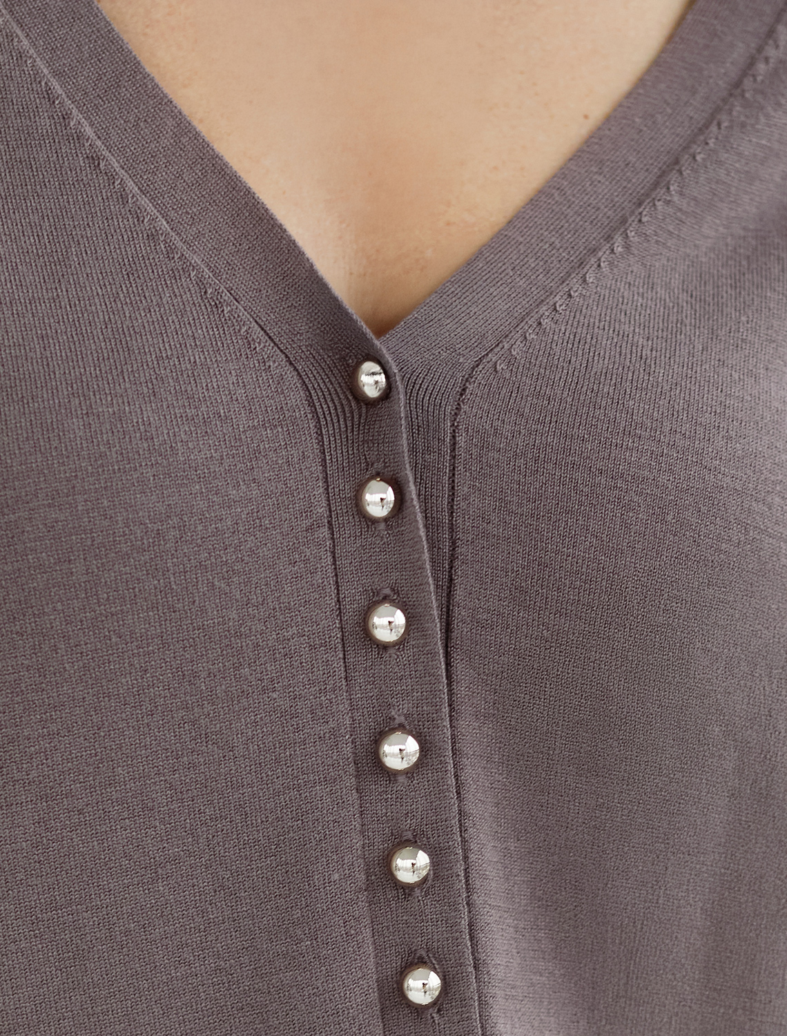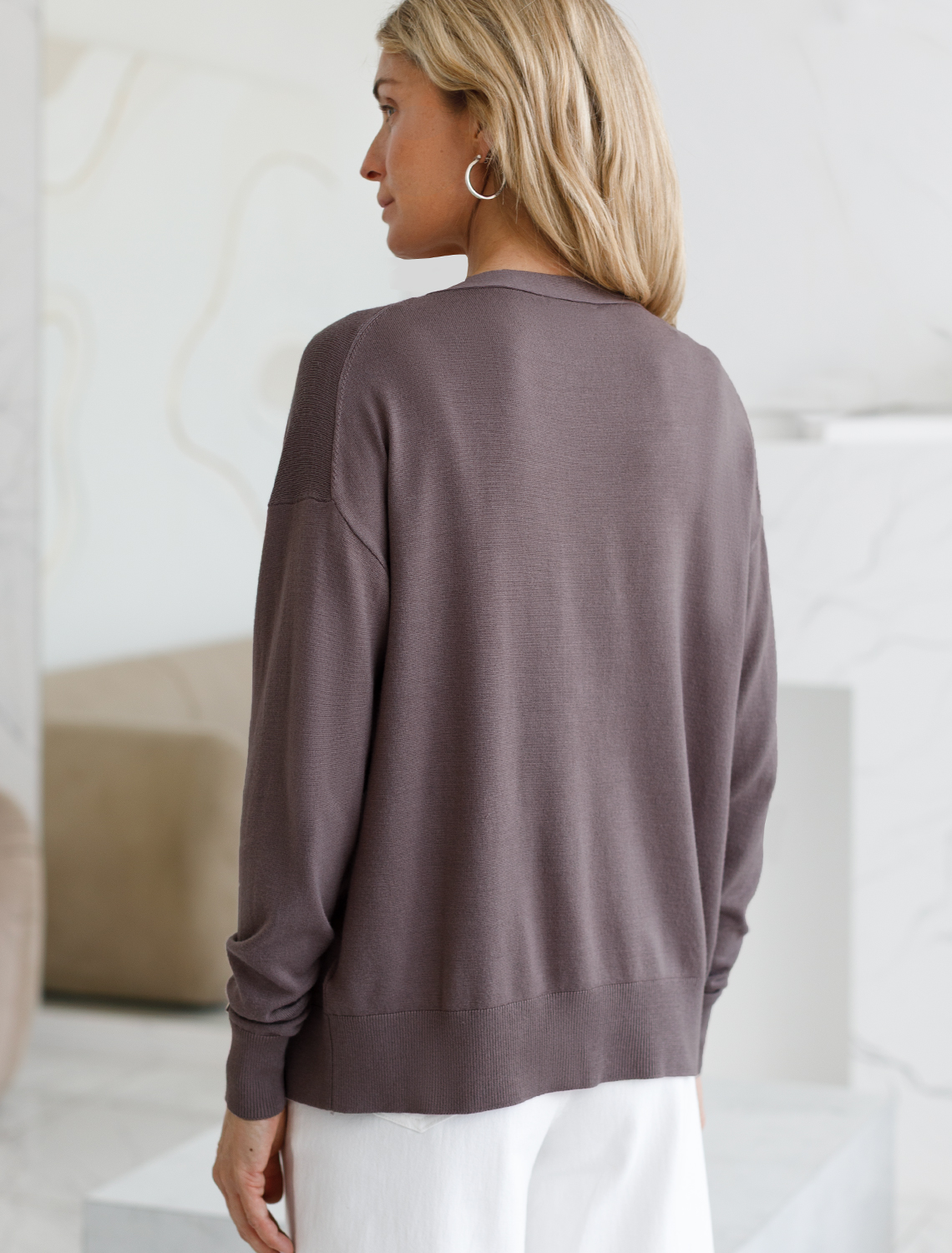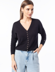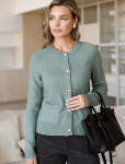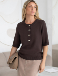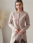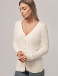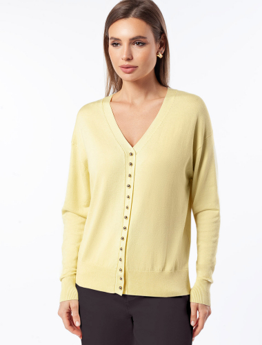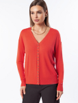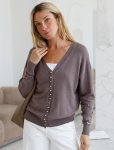 Кардиган тонкой вязки выполнен из нежной пряжи вискозы с нейлоном. Лаконичный силуэт дополнен яркой фишкой изделия - ряд золотистых пуговиц, визуально вытягивающий силуэт. Очень приятное к телу изделие, в котором будет не жарко даже в самые теплые дни. Изделие дополнено логотипом бренда. кофейный