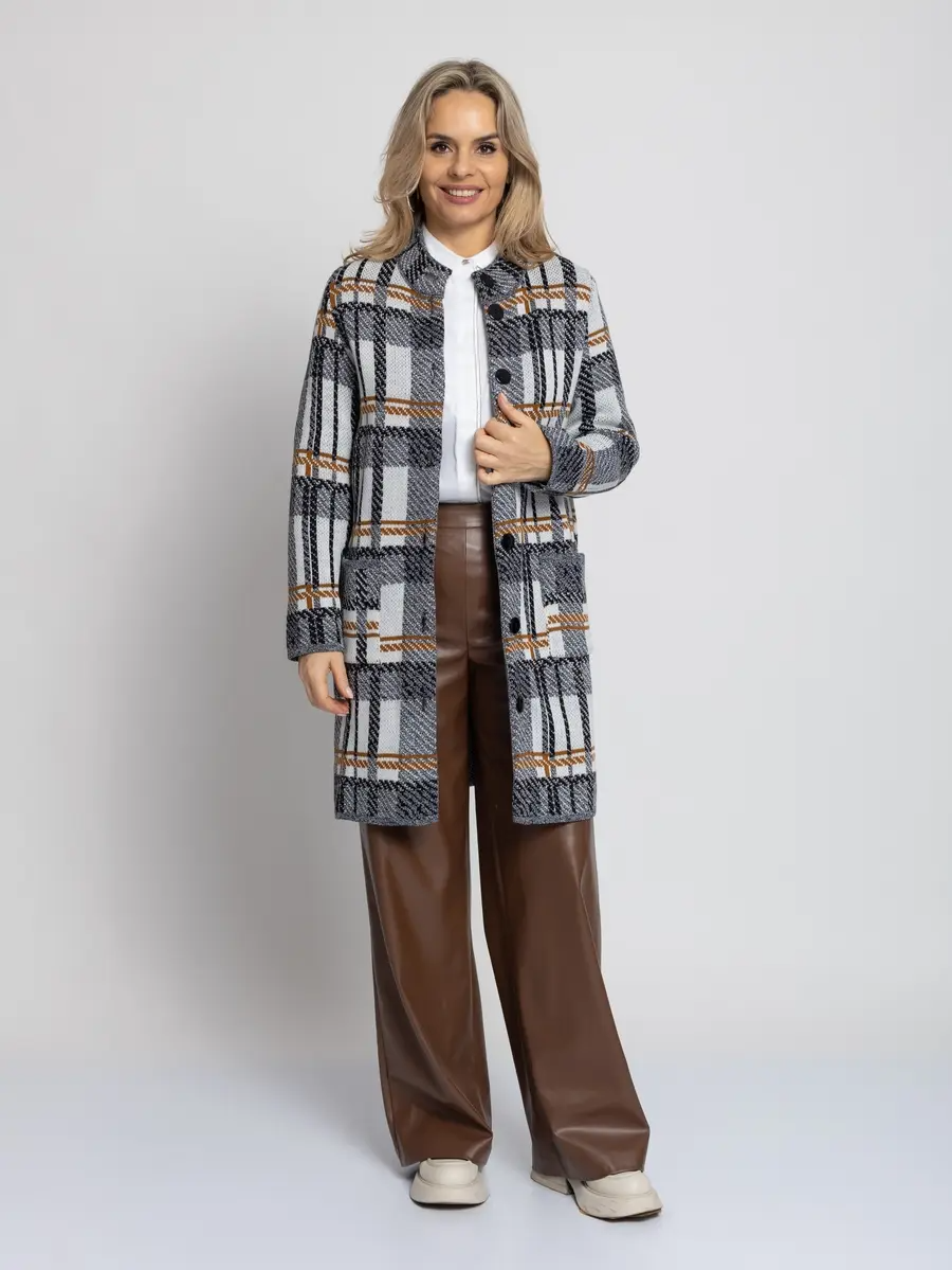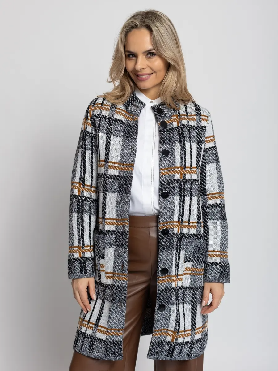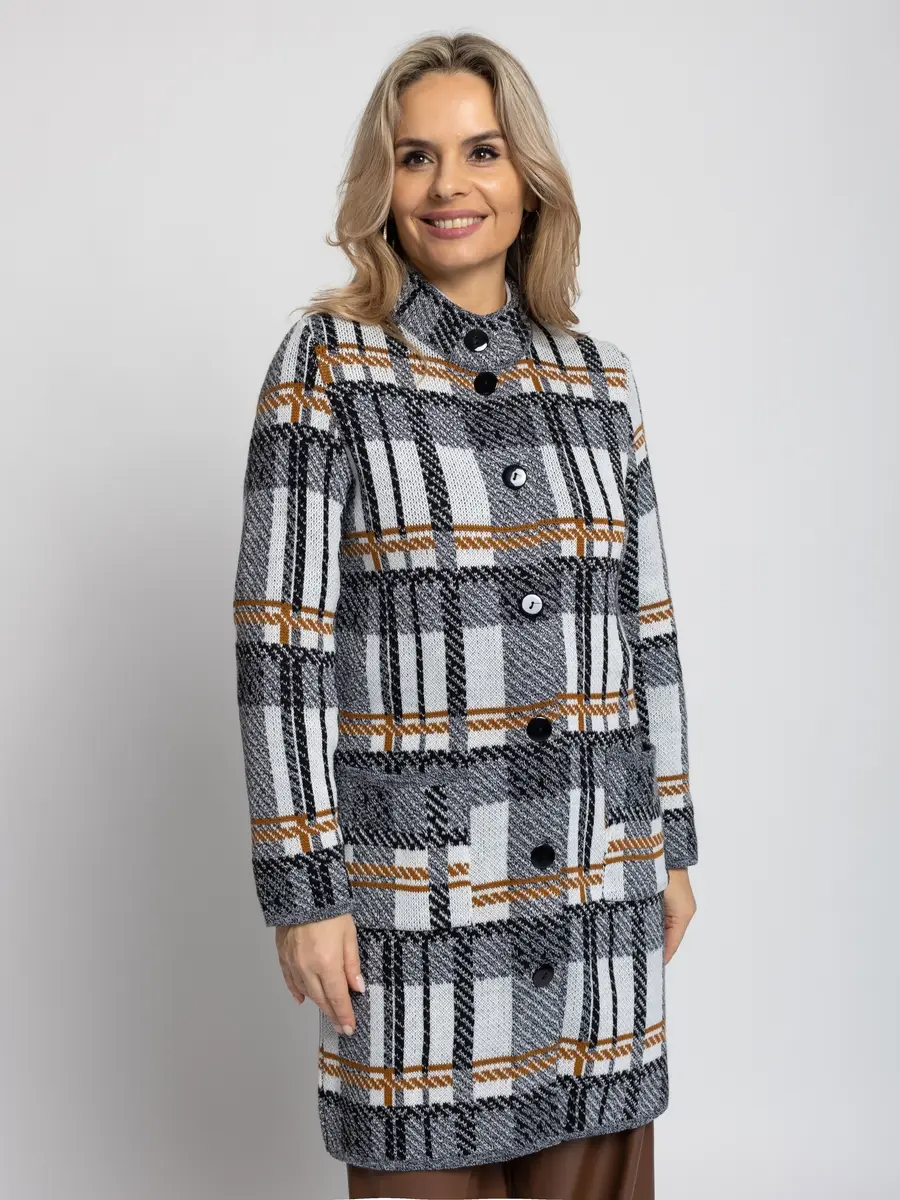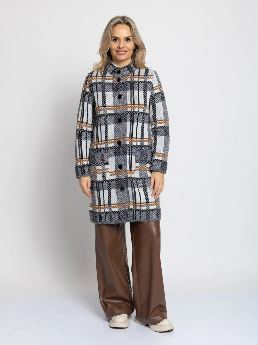 Женский эффектный вязанный кардиган прямого силуэта. Воротник-стойка. Застегивается на пуговицы Рукава втачные длинные. Два накладных кармана. Кардиган выполнен жаккардовым переплетением образующим геометрический рисунок "клетка".  Он согреет вас в прохладный день и подарит ощущение невероятного комфорта. черн-горчич