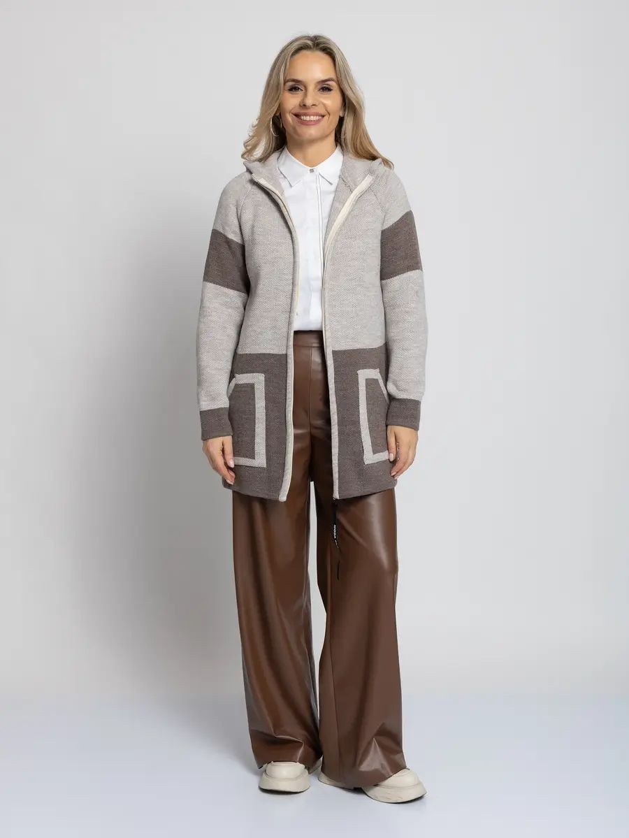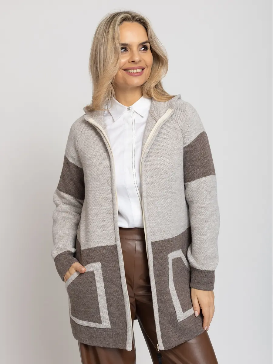 Женский вязаный кардиган прямого силуэта в спортивном стиле, с капюшоном.  Кардиган на молнии. Рукав-реглан полной длины. Накладные карманы. Контрастная отделка. кофейный