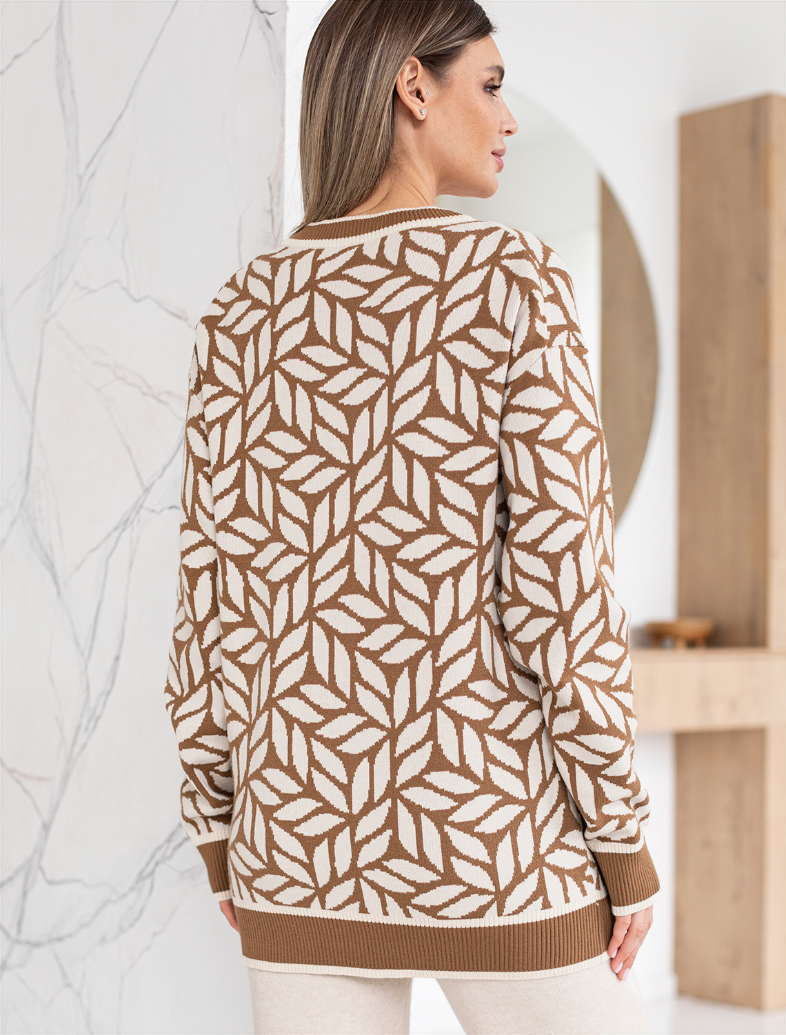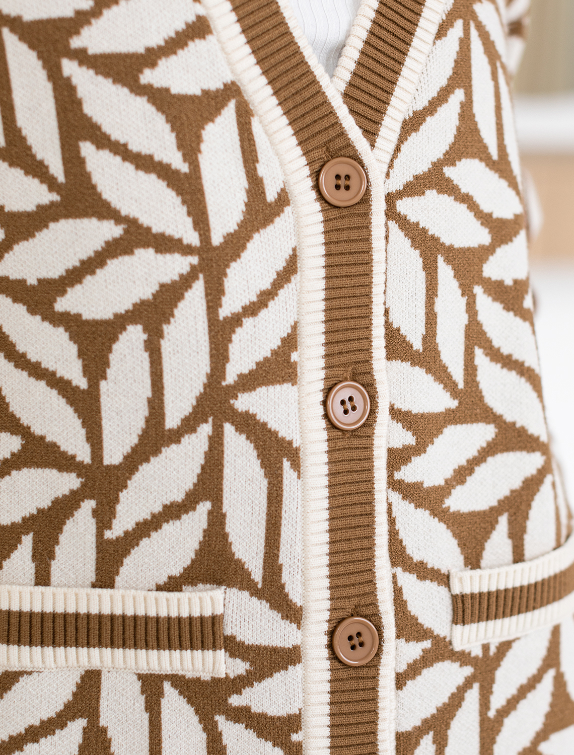Кардиган жаккардовой вязки выполнен из нежной пряжи на основе вискозы с добавлением кашемира. Мягкая модель не раздражает кожу, приятно ощущается на теле и поддерживает комфортный микроклимат. Совет стилиста: модель гармонично впишется в любой гардероб, добавив образу выразительности. Сочетайте с однотонными брюками, юбкой, платьем или джинсами карамельный-бежевый