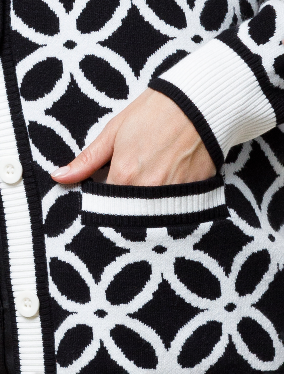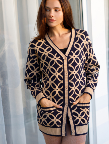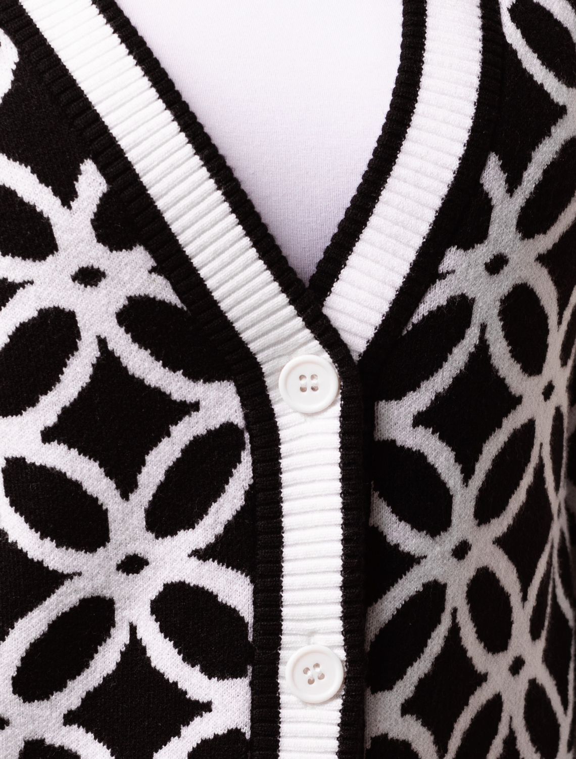 Кардиган жаккардовой вязки выполнен из нежной пряжи на основе вискозы с добавлением кашемира. Мягкая модель не раздражает кожу, приятно ощущается на теле и поддерживает комфортный микроклимат. Совет стилиста: модель гармонично впишется в любой гардероб, добавив образу выразительности. Сочетайте с однотонными брюками, юбкой, платьем или джинсами черный-белый
