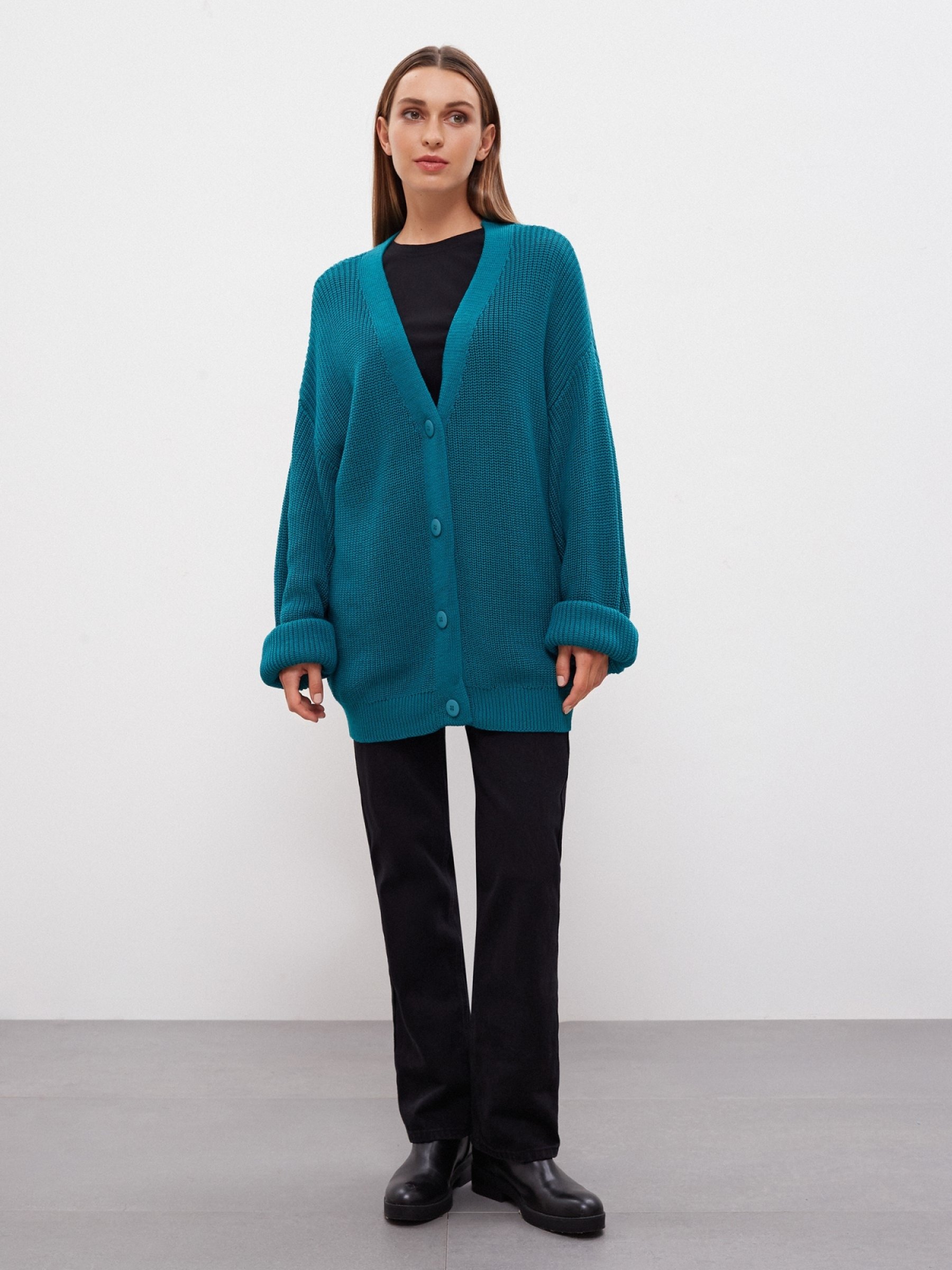 Расслабленный удлиненный кардиган кроя оверсайз со спущенной линией плеча. Выполнен из теплой пряжи с содержанием хлопка. Свободный удлиненный крой с объемными рукавами с широкими манжетами придают воздушность. А V-образный вырез визуально вытягивает силуэт. Сочетание длинного трикотажного кардигана и белой футболки будет выглядеть свежо и ярко. Дополнить такой образ лучше брюками или джинсами.