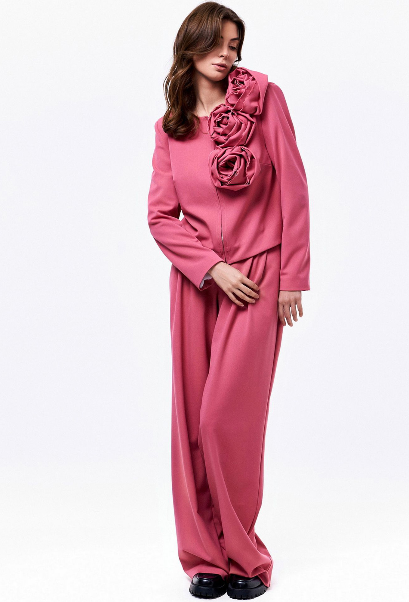 Костюм состоит из жакета и брюк. Укороченный жакет на подкладе прямого кроя с застёжкой на металлическую молнию. Декорируется пришивными текстильными цветами. Брюки прямые от бедра с защипами по переду и боковыми карманами. Застёжка в виде гульфика с молнией и двух пуговиц по поясу.