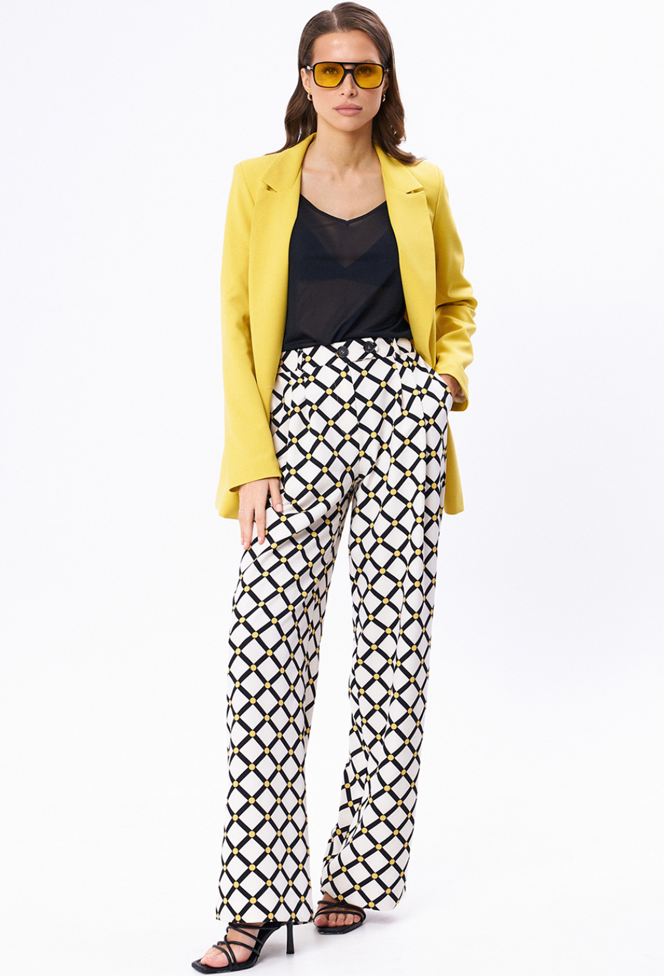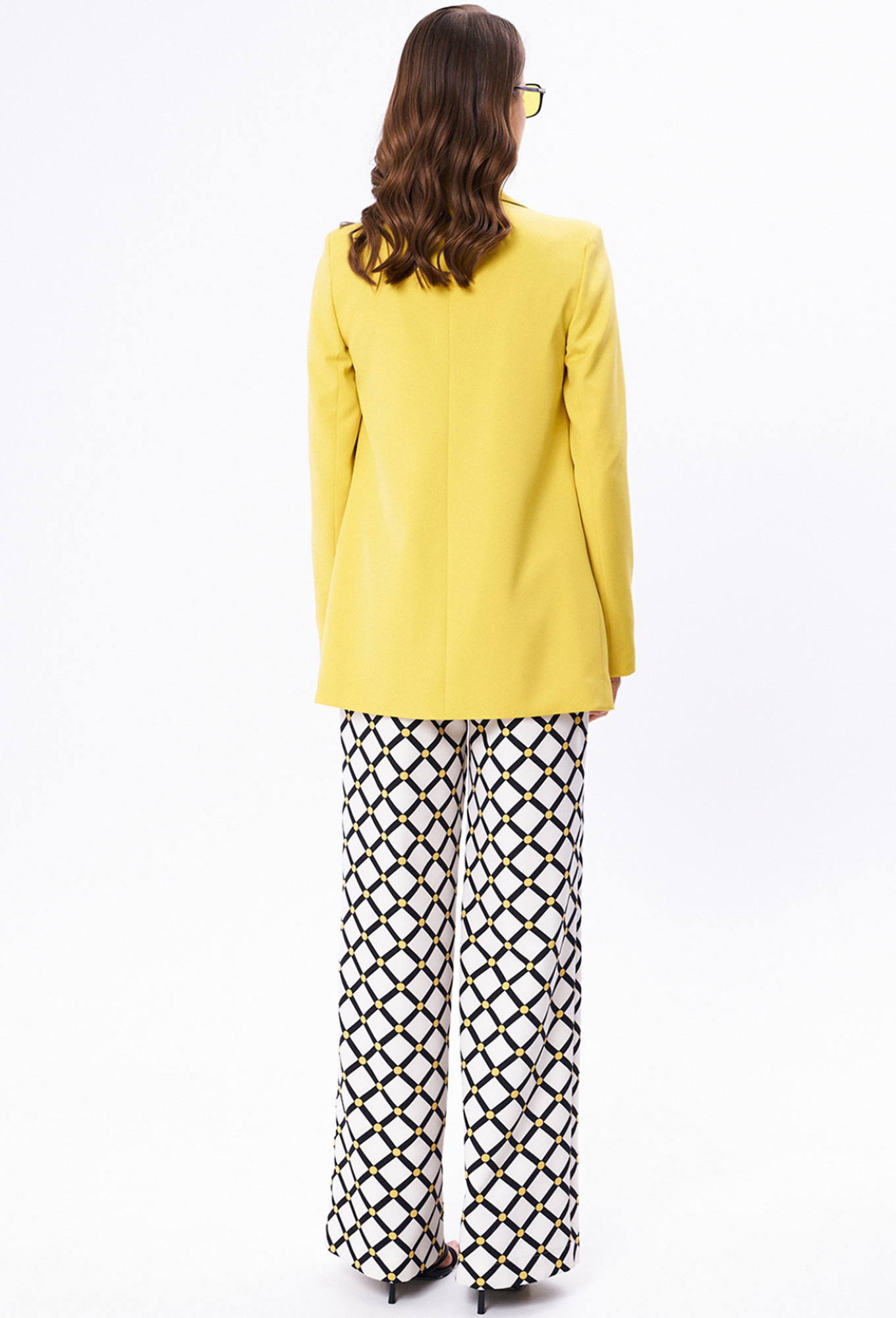 Шикарный 2-х предметный комплект, состоящий из жакета и брюк. Универсальный женский жакет на подкладке прямого силуэта. Перед с центральной застежкой на одну пуговицу, с карманами и с клапанами в шве. Воротник стояче-отложной втачной с отворотом лацкана. Рукав двухшовный, втачной. Брюки женские большого объема, прямого силуэта, вида «палаццо». На передних половинках брюк по линии талии заложены две односторонние складки, направленные в сторону бокового шва и функциональные карманы с отрезным бочком. На задних половинках находятся по две талиевые вытачки. Пояс отрезной, притачной, с уступом на правой передней половинке. На поясе шлевки. Верхний край пояса расположен на естественной линии талии. Застежка брюк – классический гульфик. Застежка пояса на две пуговицы и две петли. Длина брюк в пол.