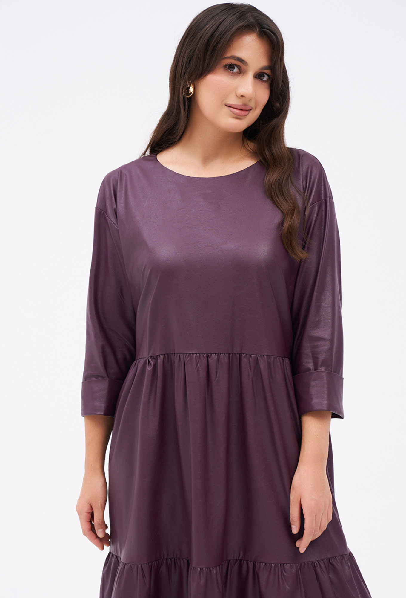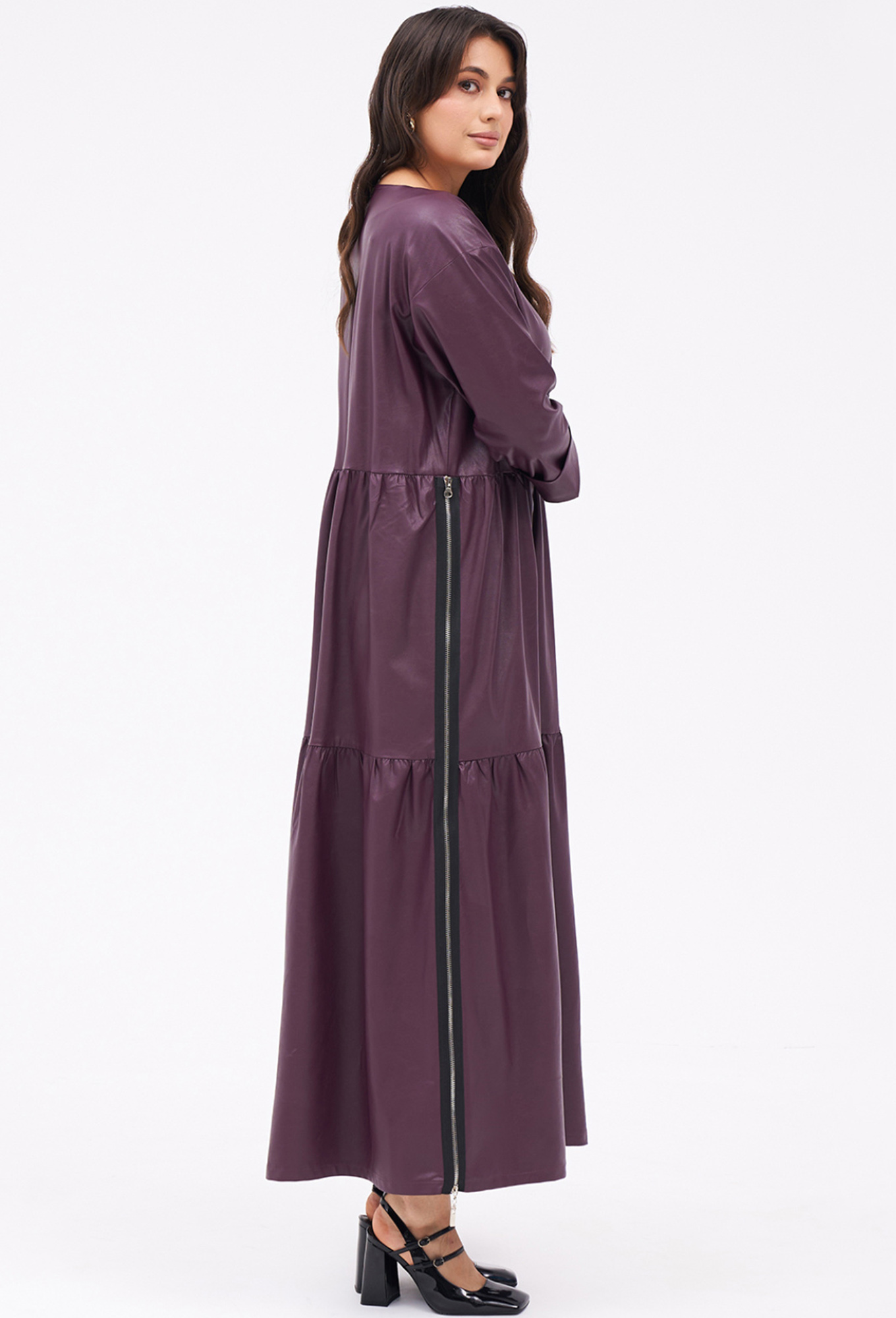 Платье длиной миди из тонкой экокожи с хлопковой изнанкой. Отрезное по талии. Юбка делится на два присборенных волана с декоративными молниями по бокам. Длина рукава 3/4.