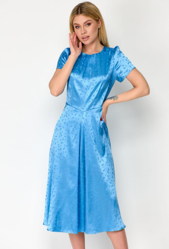Платье женское прилегающего силуэта. Перед с нагрудными вытачками и подрезом из складок выше линии бедра. Спинка с талиевыми вытачками и потайной застежкой на тесьму «молния» в среднем шве. Воротник стойка, образующая качель. Рукав цельнокроеный короткий. Низ платья асимметричный: правый бок длиной до линии колена, левый длиной миди.