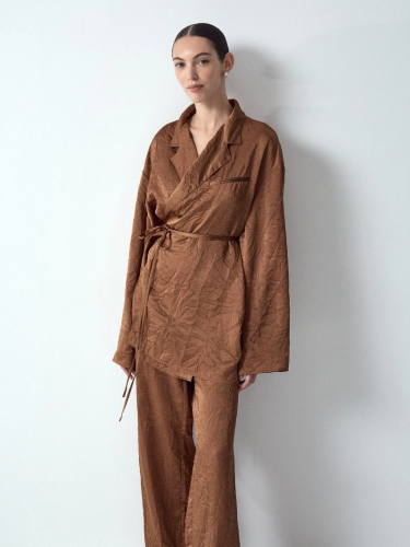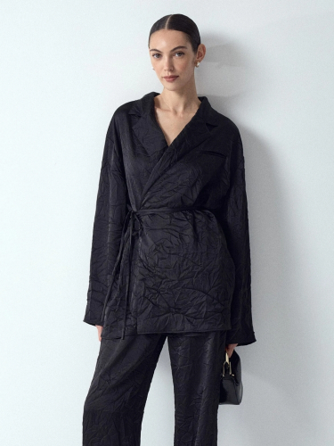 Чёрное кимоно из гладкого материала с жатым эффектом создаст непринуждённый образ для вечеринки или выходного дня. Дополнено завязкой в талии, что позволяет подогнать вещь под свои параметры парой движений. Кимоно выполнено без подкладки, подходит в качестве второго слоя. Лучшее сочетание — с базовым топом и брюками из комплекта