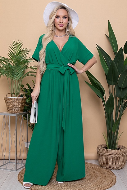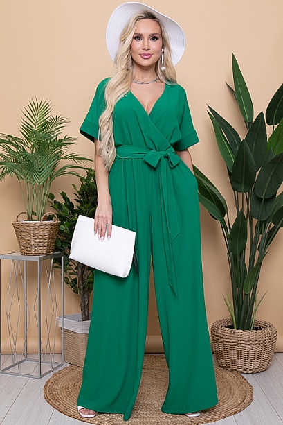 Комбинезон из шелкового текстильного полотна свободного силуэта.Лиф с запахом по переду и цельнокроеными рукавами.По линии талии эластичная резина.Штанины свободные,прямые с функциональными карманами по бокам.В комплекте пояс из основной ткани.