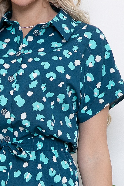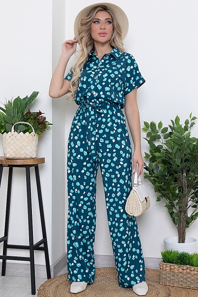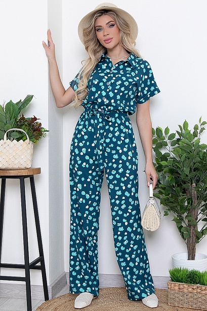 Комбинезон из текстильного полотна с цельнокроеными рукавами и отложными манжетами.Воротник отложной на стойке.Застежка на петли и пуговицы до талии.По талии кулиска с эластичной резиной и завязывающимися поясками по переду.Брюки свободного прямого силуэта.