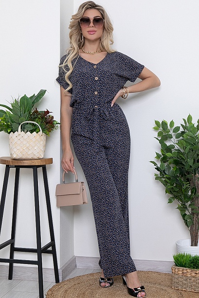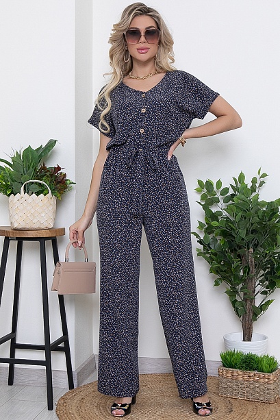 Комбинезон из комфортного  текстильного полотна свободного силуэта.Лиф с V-образным вырезом,с центральной застежкой на пуговицы.Рукава цельнокроеные с отложными манжетами.Штанины свободные прямые.По талии притачная кулиска с эластичной резиной.Завязывающиеся пояски из кулиски,позволяют регулировать ширину по талии.