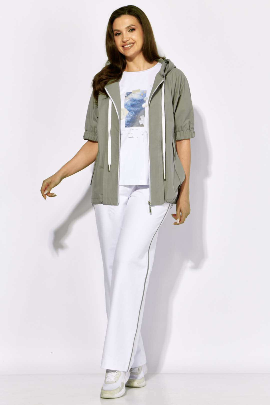 Комплект женский, 3х предметный, состоящий из ветровки, футболки и брюк. Ветровка прямого силуэта с коротким цельнокроеным рукавом. По низу рукава манжета с резинкой. По переду планки, рельефы и наклонные карманы с клапанами. Застежка центральная на "молнию". Горловина оформлена капюшоном с кулисой из отделочного шнура. По спинке средний шов, подрез и декоративная нашивка. Низ куртки по спинке чуть опущен, с притачной планкой и кулисой из резинки с фиксаторами, для регулировки ширины по низу. Футболка с коротким спущенным рукавом. Горловина круглой формы. Перед задекорирован принтом. Брюки прямые, с кантами по боковым швам. По переду наклонные карманы. Пояс притачной с резинкой по кругу.