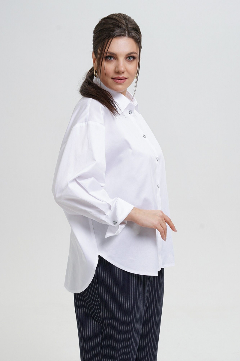 Блузка прямого, свободного силуэта, с застёжкой на петли, пуговицы, со спущенной линией плеча, с фигурной линией низа. Спинка со средним швом с драпировкой, с V- образным вырезом по кокетке. Рукава втачные, одношовные, длинные, понизу с разрезом, с мягкими складками и притачными широкими манжетами на петлю, пуговицу. Воротник стояче-отложной на отрезной стойке на петлю, пуговицу.