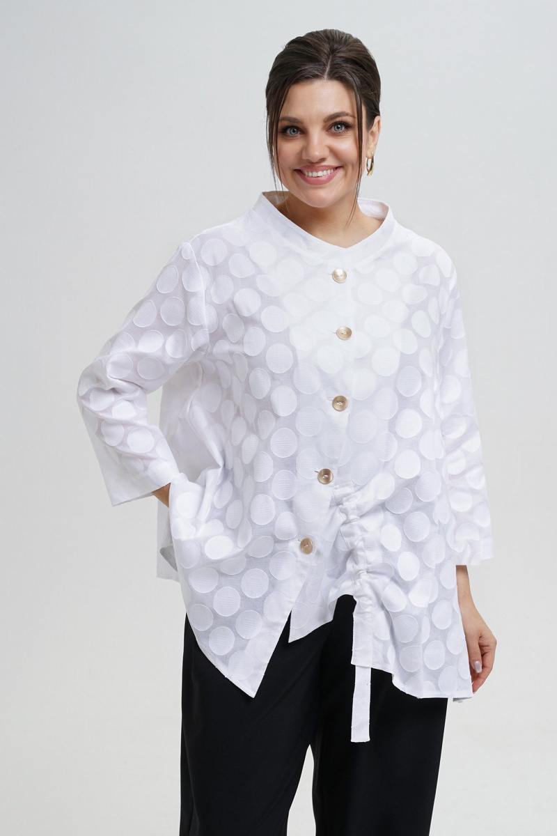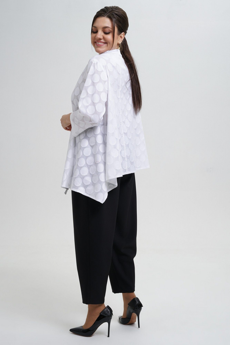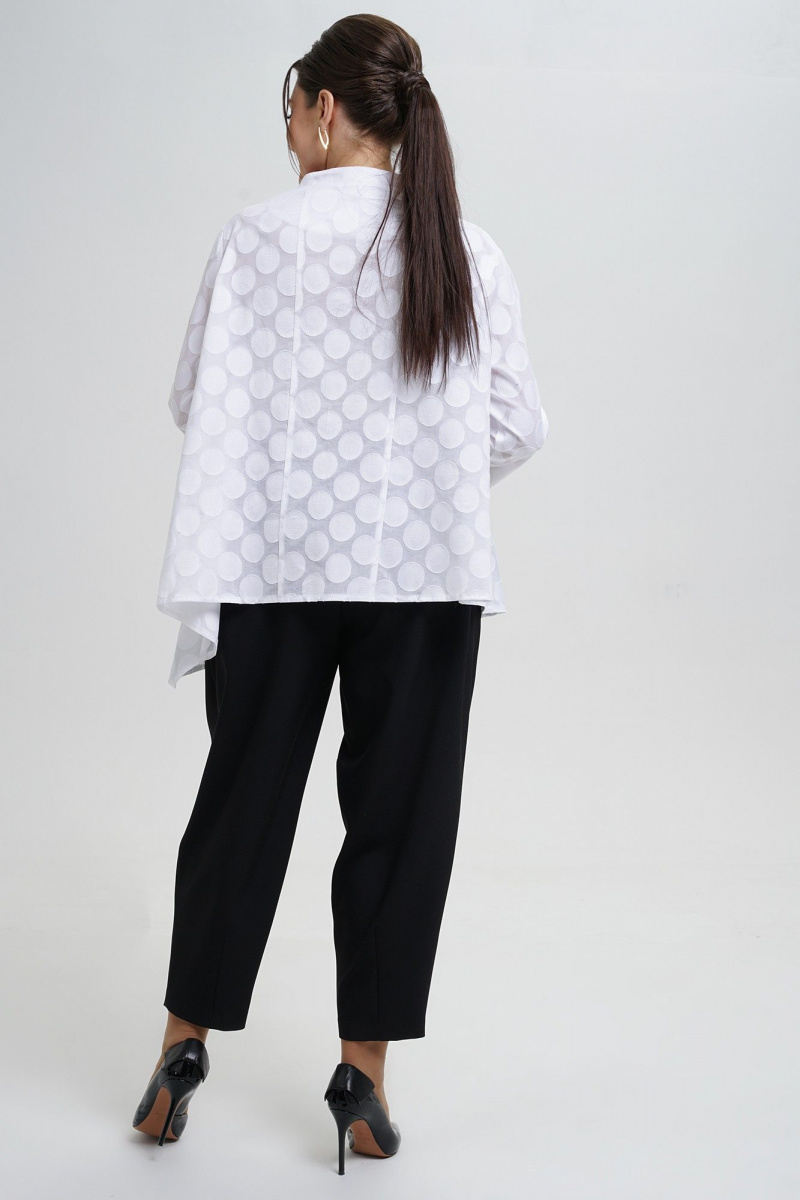 Блузка свободного А- образного силуэта, с ассиметричной застёжкой на петли, пуговицы, с фигурным разноуровневым низом. Перед понизу левой части с кулисой и завязкой. Спинка с рельефными швами. Рукава втачные, одношовные, длиной 7/8. Воротник стойка.