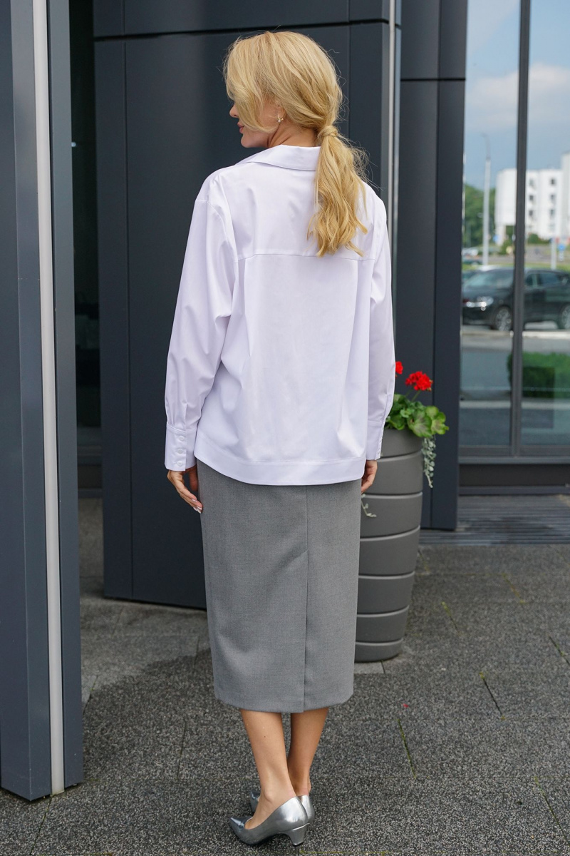Блузка прямого, свободного силуэта, с застёжкой по переду с втачными планками (доходящей до линии талии) на петли, пуговицы и отделочный пояс с пряжкой, со спущенной линией плеча. Низ обработан широкой обтачкой, разноуровневый. Правая часть переда с залаженными мягкими складками, левая часть со сборкой. Спинка с притачной кокеткой и мягкими складками. Рукава втачные, одношовные, длинные, понизу с разрезом, мягкими складками, притачными манжетами на петли, пуговицы. Воротник стояче-отложной на отрезной стойке с петлёй и пуговицей.