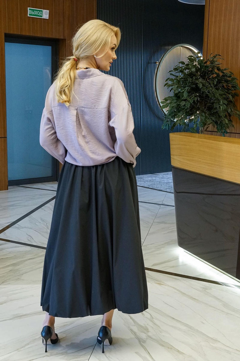 Юбка формы баллон, на подкладке, на притачном поясе, с застёжкой на потайную молнию в левом боковом шве и по поясу на две петли, пуговицы, в боковых швах карманы. Переднее и заднее полотнище со сборкой верху от пояса и по низу изделия.