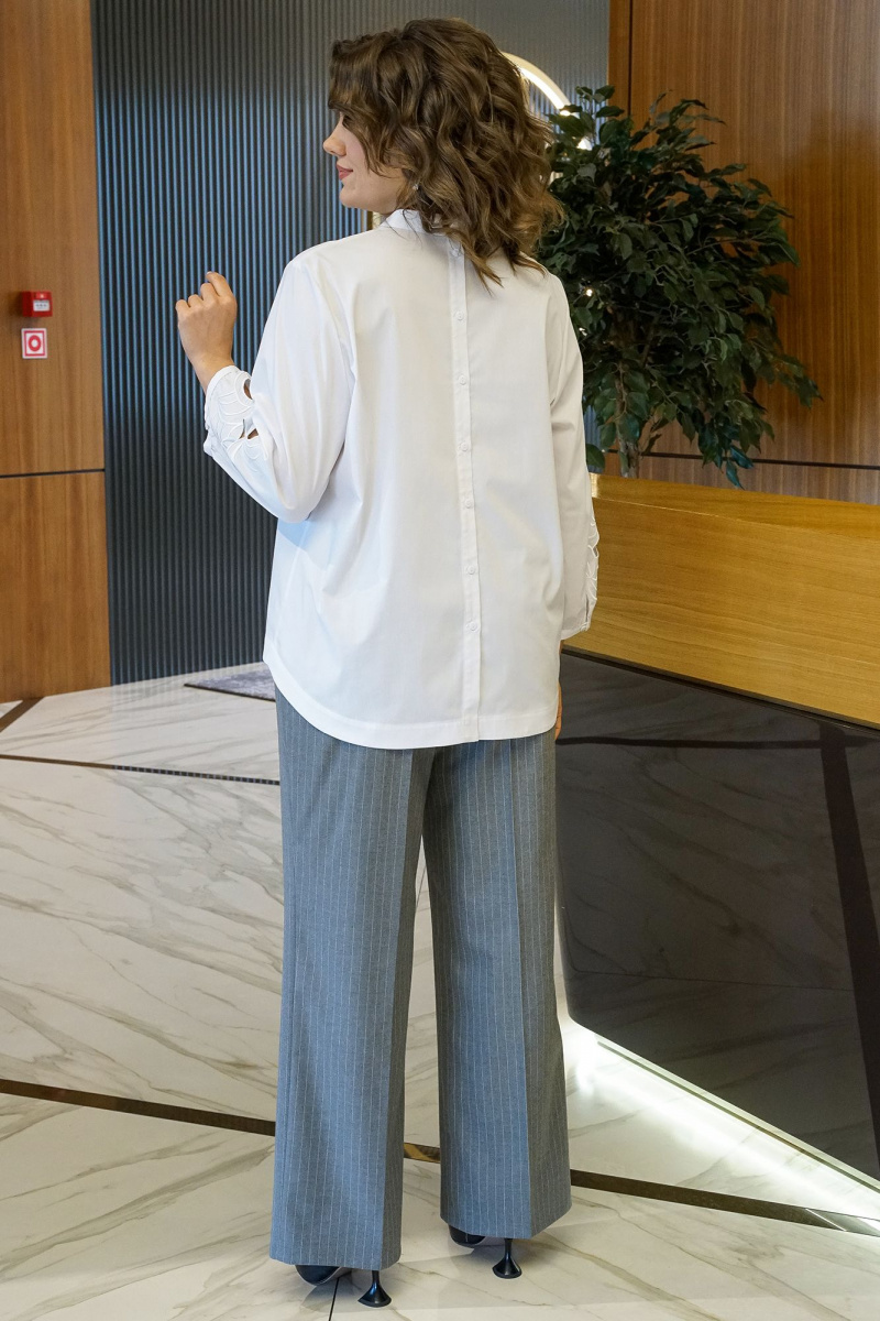 Брюки длинные, типа «клёш» полуприлегающего силуэта по бёдрам и от линии колена идут на расширение, со сгибами, на притачном поясе с резинкой по боковым. Застежка типа «гульфик» на молнию и по краю пояса на петлю, пуговицу. Задние части с талевыми выточками.