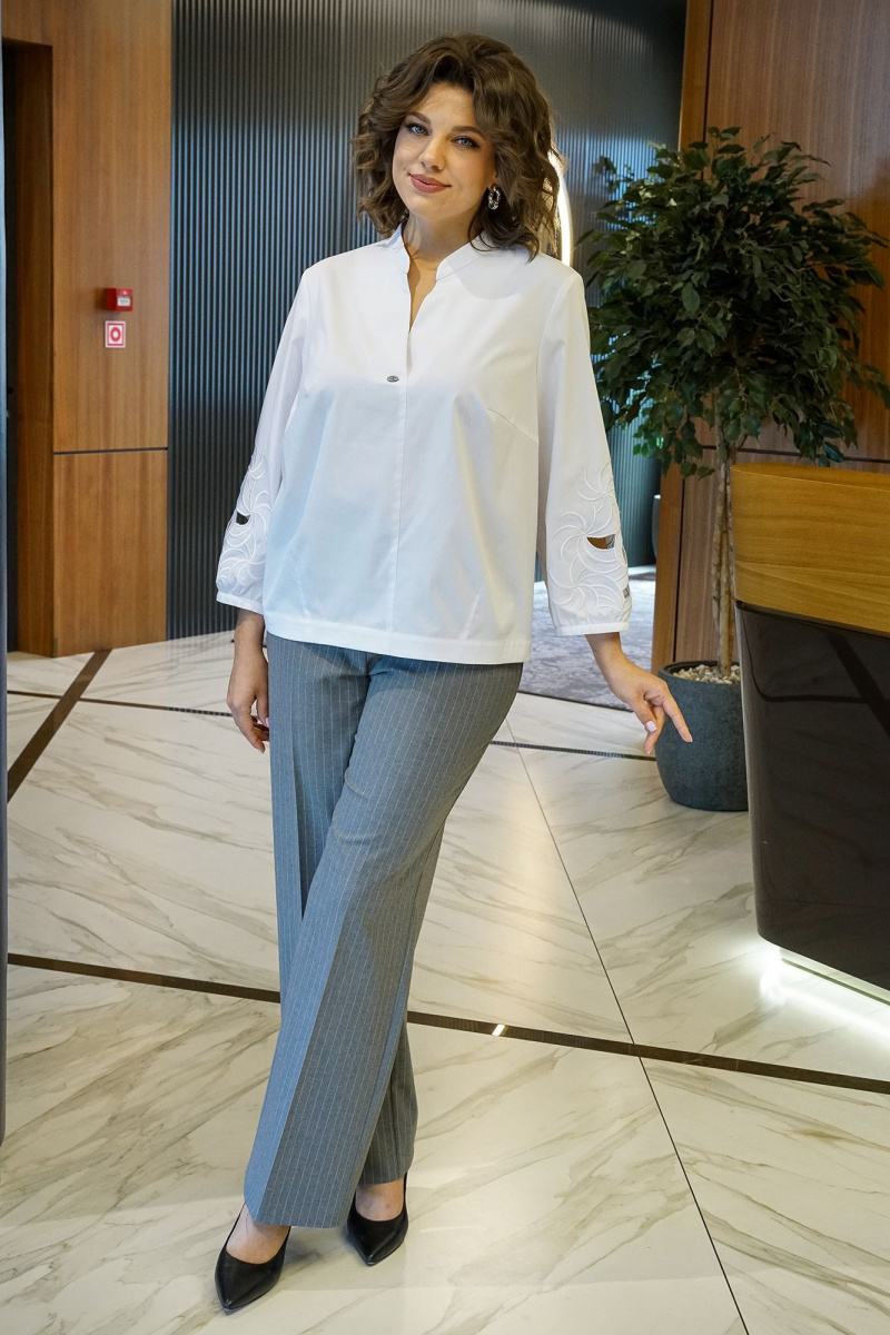 Блуза прямого, свободного силуэта, с вырезом по переду V- образной формы с небольшим запахом, с разноуровневым низом (спинка длиннее переда). Низ рукавов декорирован вышивкой, перед нашивкой.