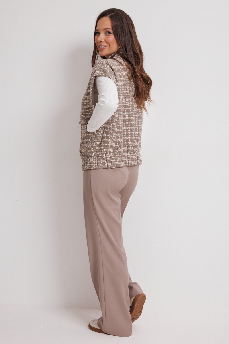 Стильный комплект из жилета, водолазки и брюк. Жилет свободного кроя, на подкладке, с центральной застежкой на молнию. Выполнен из фактурной рогожки. Линия плеча слегка спущена. Горловина обработана стойкой. Жилет дополнен удобными боковыми карманами. Для придания легкого объема низ жилета слегка присборен на эластичную тесьму. Водолазка со стойкой прямого кроя выполнена из нежного трикотажа в рубчик. Рукав втачной. Брюки классического прямого кроя с притачным поясом, дополненным эластичной тесьмой. Посадка средняя. Дополнены удобными боковыми карманами. Застежка гульфик на молнию и пришивную пуговицу. Брюки выполнены из комфортной костюмной ткани. Длина жилета от плечевого шва 63см. Длина водолазки от плечевого шва 64см. Длина рукава 60см. Длина брюк по боковому шву 104см.