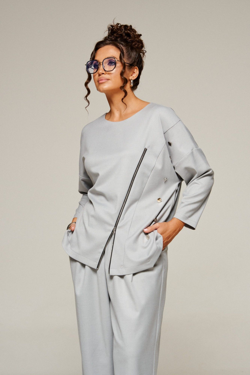 Костюм состоит из 2-х предметов одежды: блузона и брюк. Выполнен из костюмной ткани, мягкой и приятной на ощупь, актуальной расцветки.