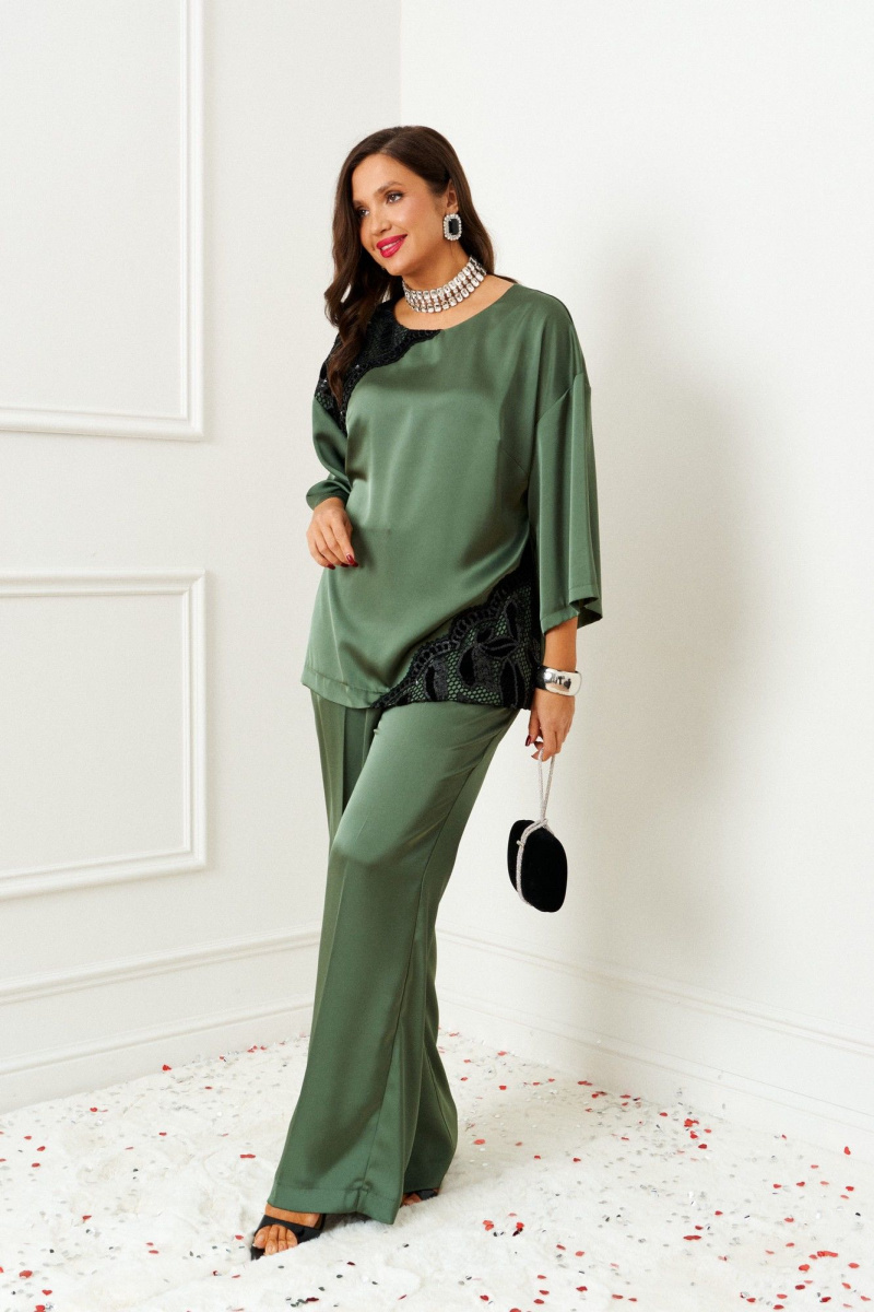 Изысканный костюм состоит из 2-ух предметов: блузки и брюк. Выполнен из атласного полотна в сочетании с кружевом. Основная ткань нежная, гладкой фактуры, приятная на ощупь и с блестящей поверхностью, она легко драпируется и очень выгодно и дорого подчёркивает образ; отделочная ткань придает праздничный шарм.