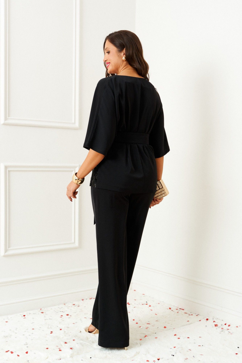 Изысканный костюм состоит из 2-ух предметов: блузки и брюк. Выполнен из эластичного полотна в сочетании с кружевом. Основная ткань нежная, гладко-бархатистой фактуры, приятная на ощупь, она легко драпируется и очень выгодно и дорого подчёркивает образ; отделочная ткань придает праздничный шарм.