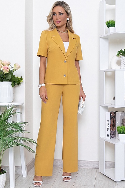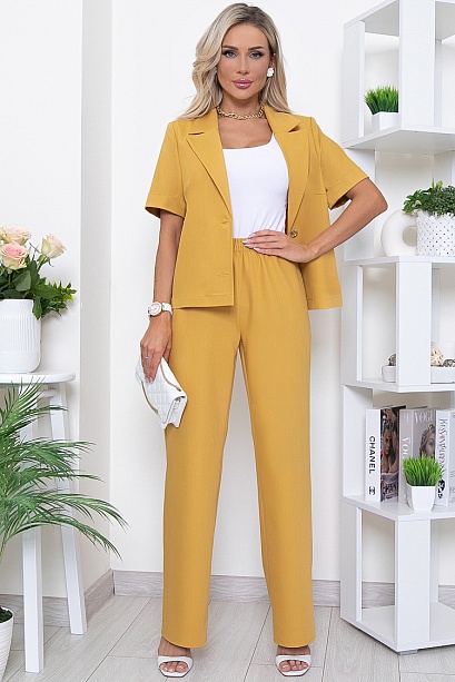Брючный комплект из комфортной вискозной костюмной ткани. Жакет прямого силуэта с центральной застежкой на две пуговицы.Воротник отложной с лацканами.Брюки свободного, прямого силуэта с эластичной резиной по поясу.В боковых швах функциональные карманы.
