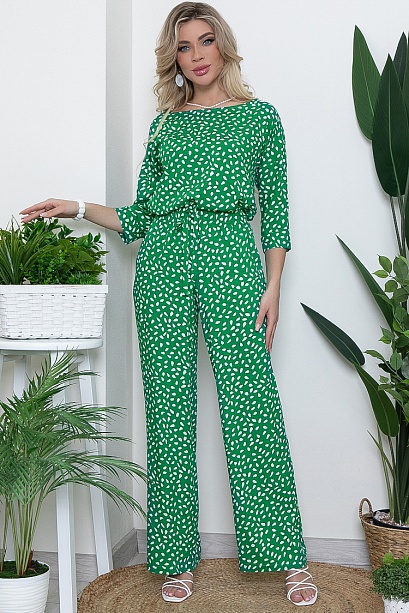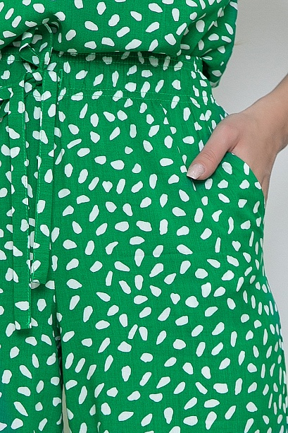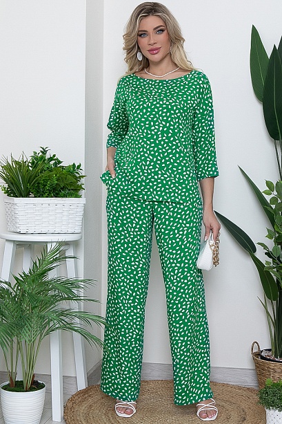 Брючный комплект из комфортного,вискозного текстильного полотна.Блузка свободного силуэта.Брюки свободного силуэта с посадкой по талии присборенные на эластичную резину и дополненные регулируемой кулиской.