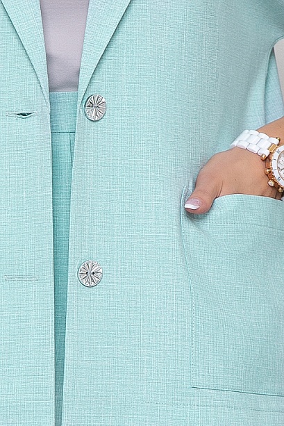 Комплект из легкой костюмной ткани.Жакет свободного силуэта с цельнокроеными рукавами, центральной застежкой на две пуговицы и удобными функциональными карманами по переду.Воротник отложной с лацканами.Шорты свободного прямого силуэта с высокой посадкой по переду имитация гульфика,по бокам функциональные карманы.Пояс собран на эластичную резину по бокам и спинке.