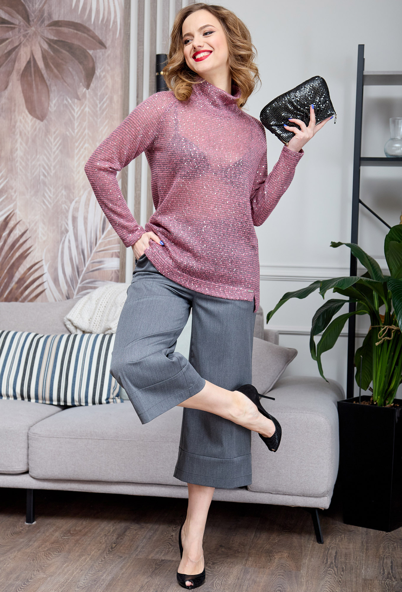 Комплект женский (пуловер и брюки-кюлоты). Пуловер прямого силуэта из трикотажного полотна с пайетками, рукав реглан, по горловине стойка. Боковые швы пуловера переходят на полочку и заканчиваются разрезами, низ фигурный , полочка короче чем спинка, пришит металлический эл-т логотип бредна. Брюки расширенные к низу, по низу отстрочка в виде манжеты. По бокам карманы, по поясу резинка.