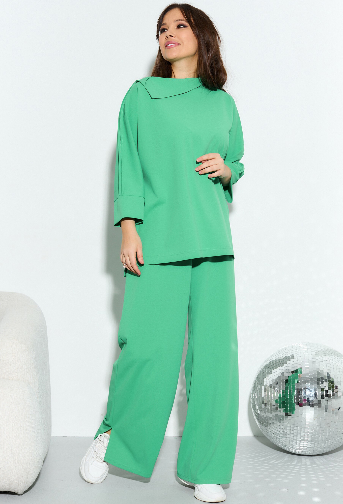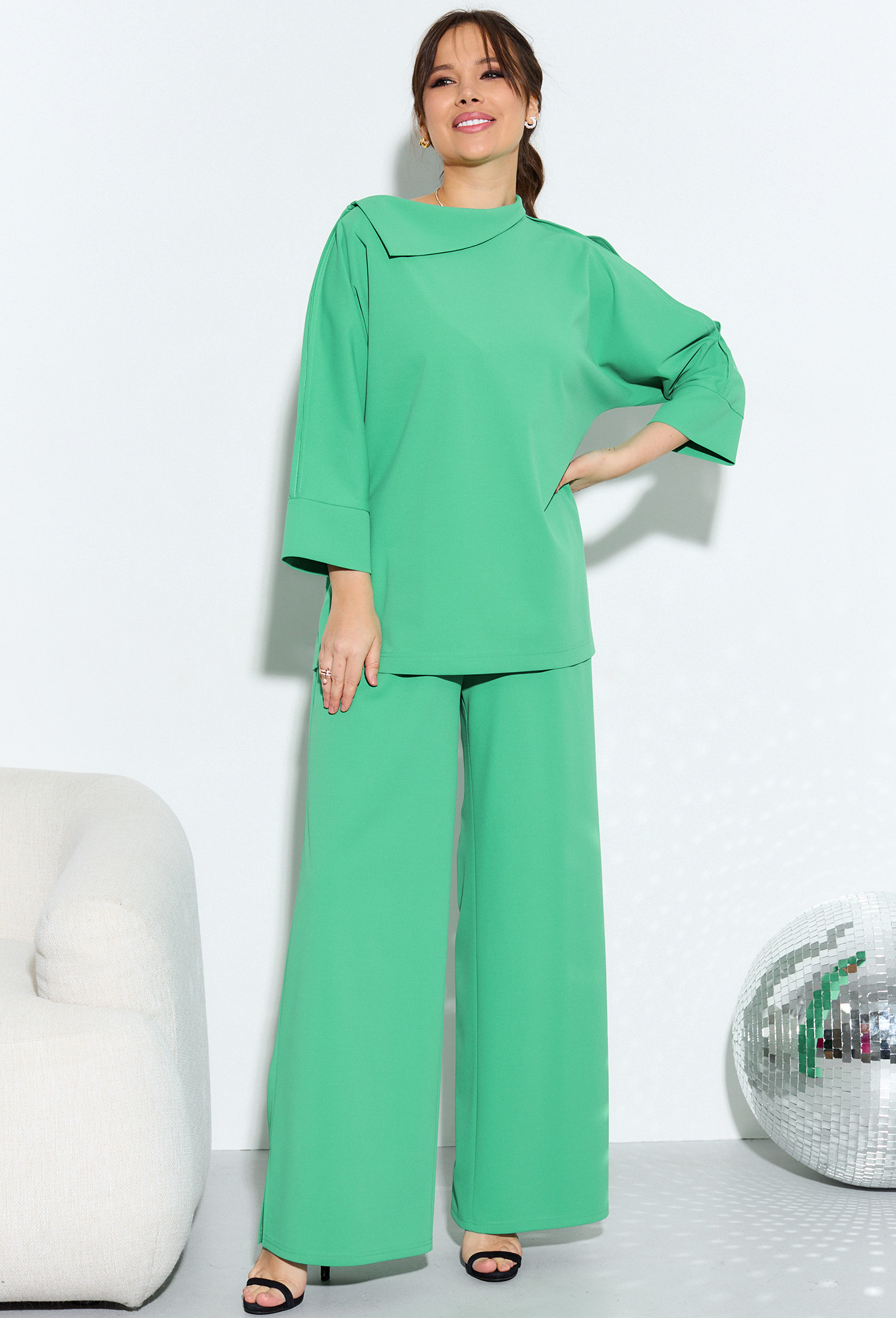 Комплект женский 2-х предметный (блузка, брюки) из трикотажного полотна. Блузка прямого силуэта, рукав- "летучая мышь", по бокам разрезы, спинка длиннее полочки. Горловина ассиметричная с отложным воротником. Верхний шов рукава идет на верх в разутюжку, с одной стороны "слезка". По низу рукава идет манжет. Брюки прямые, по низу разрез, пояс на резинке, по бокам карманы.