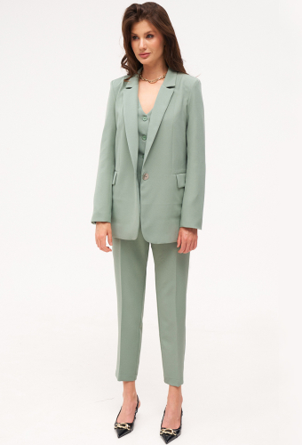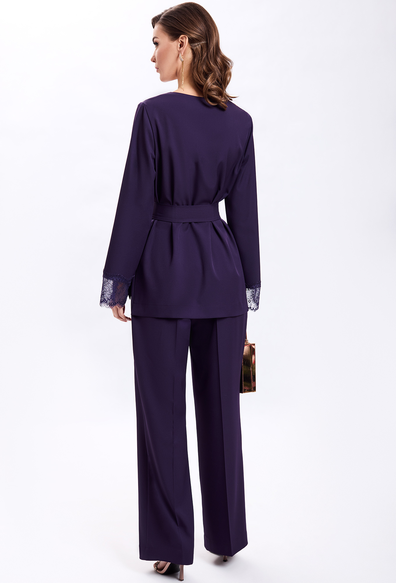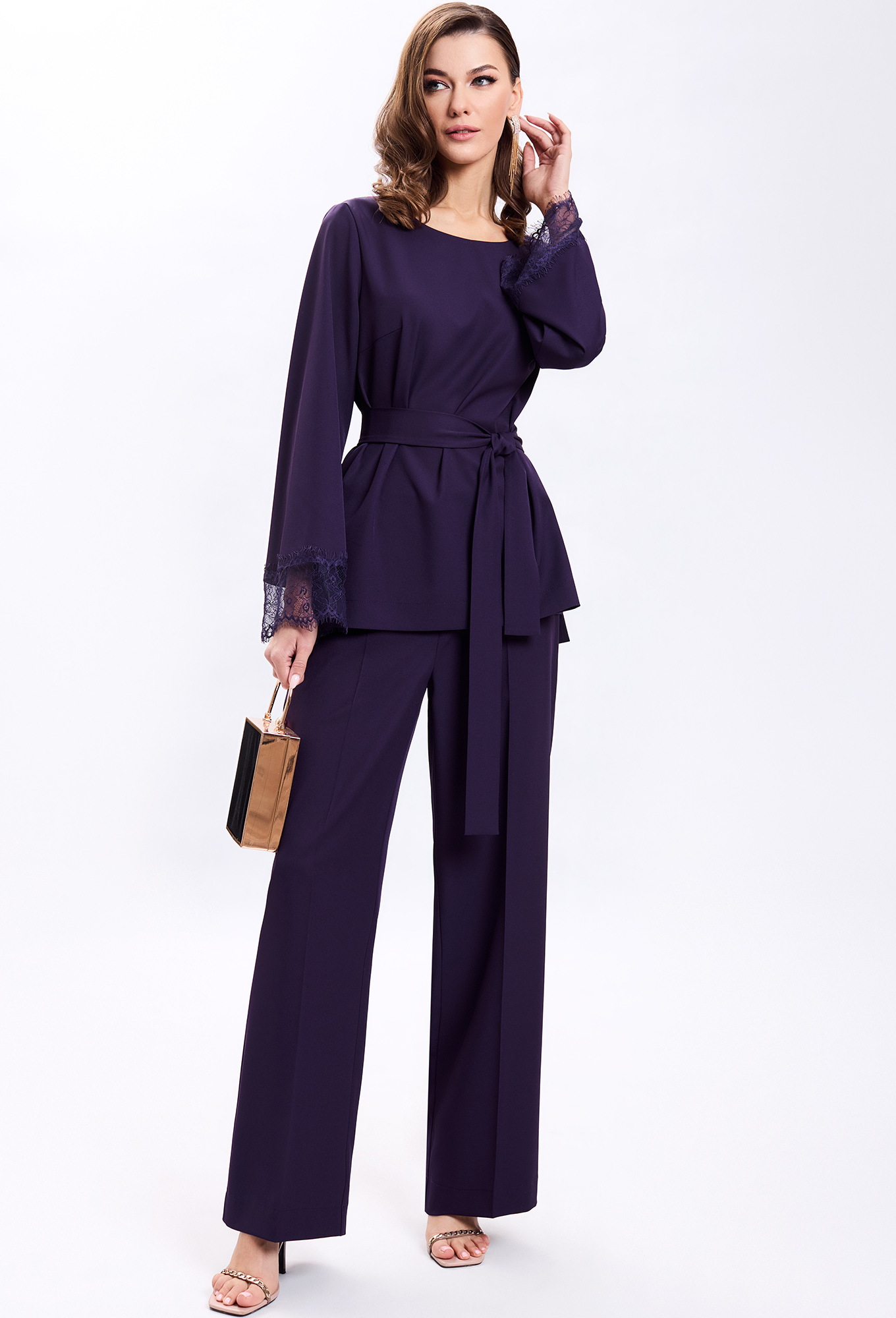 Костюм состоит из блузки и брюк. Блузка прямого силуэта. Рукав одношовный, втачной. По низу рукава притачено кружево. По переду блузки - нагрудная вытачка, выходящая из бокового шва. В боковых швах блузки обработаны разрезы. Спинка длиннее переда. К блузке прилагается пояс, выполненный из основной ткани. Брюки прямого силуэта, с притачным прямым поясом на одну пуговицу. Пояс со шлевками, по спинке на резинке. Передняя часть брюк с застежкой на молнию. Брюки с боковыми карманами с наклонным входом. По передним и задним частям - стрелки. Фурнитура может быть изменена, сохраняя целостность художественного замысла. Длина блузки по середине спинки-71см, длина рукава-60см, длина брюк с учетом пояса-105см.