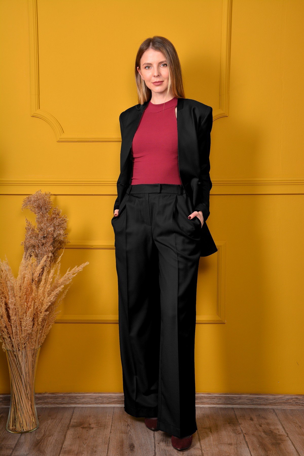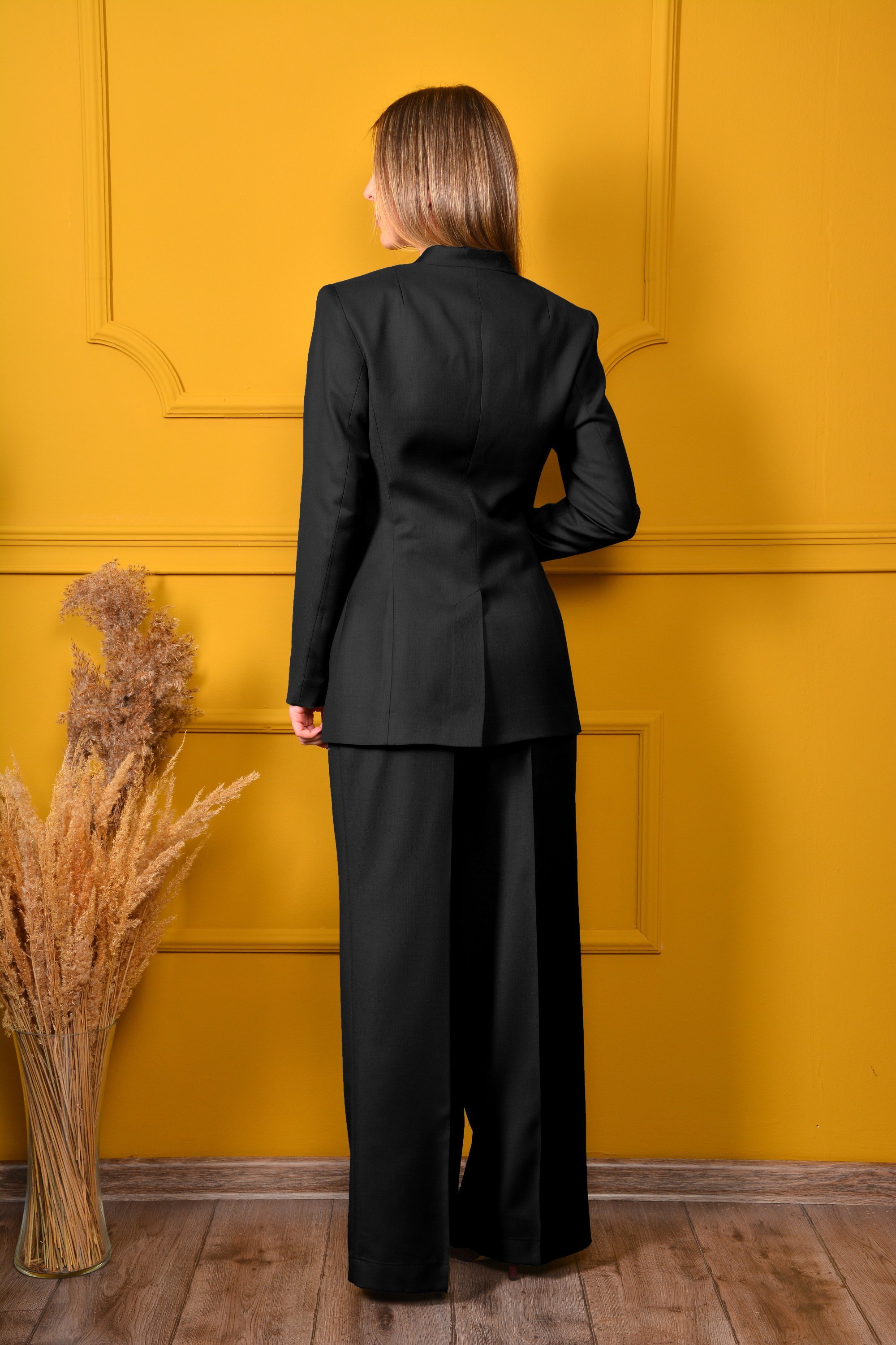 Двубортный жакет умеренного объема, полуприлегающего силуэта. Карманы прорезные, в рамку с клапаном. Спинка имеет плечевые вытачки, средний шов со шлицей. Рукава двухшовные, длинные. Воротник – стойка, переходящая в край борта, имеющий V-образную форму. Застежка на прорезные петли и пуговицы. Жакет полностью обработан притачной подкладкой. Длина изделия до середины бедра. Длина по спинке 71 см, длина рукава 61 см. Брюки умеренного объема, прямого силуэта. На передних половинках брюк заутюжены стрелки, переходящие в складки по линии талии. На задних половинках также заутюжены стрелки. В боковых швах расположены карманы. Застежка-гульфик. Пояс отрезной, притачной. В задней части пояса вставлена эластичная тесьма (резинка). На пояс настрочены шлевки. Выступающая часть пояса застегивается на петлю и крючок. Длина брюк в пол 114 см, ширина по низу 27-34 см в зависимости от размера. Фурнитура и материалы отделки могут незначительно отличаться от тех, что на фотографии.