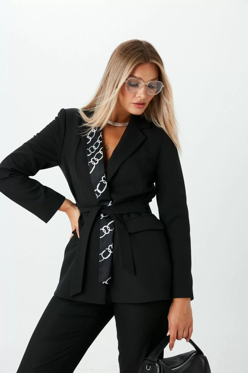 Костюм 2ка, состоящий из жакета и брюк. Жакет однобортный малого объёма приталенного силуэта с застёжкой на петлю и пуговицу. По бокам расположены функциональные прорезные карманы с клапаном. Жакет на подкладке. В комлекте к жакету идёт пояс. В качестве декора на воротнике жакета выполнена вставка из атласной ткани с принтом. Брюки умеренного объема, прямого силуэта. На передних половинках брюк заутюжены стрелки, переходящие в складки по линии талии. На задних половинках также заутюжены стрелки. По бокам расположены функциональные карманы. Застежка-гульфик. Пояс отрезной, притачной. На пояс настрочены шлевки. Пояс застегивается на петлю и крючок.