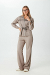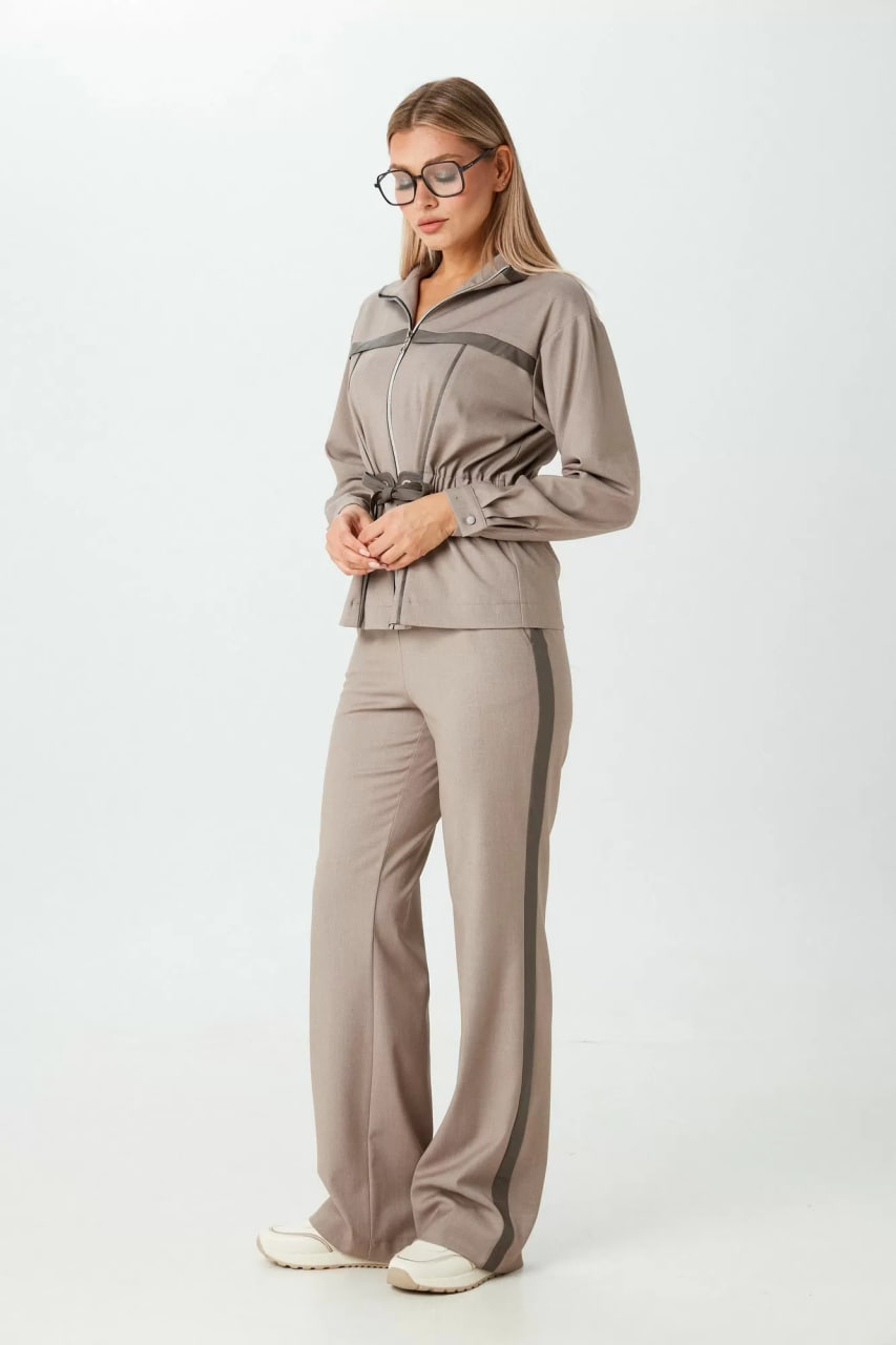 Костюм 2ка, состоящий из рубашки и брюк. Рубашка с застёжкой на молнию и воротником - стойкой. По талии рубашки расположена кулиса и шнурок для приталивания. Декоративные элементы по переду рубашки и шнурок выполнены из велюра. Манжеты на пуговицах. Брюки прямого силуэта на эластичной резинке по талии. По переду расположены карманы с наклонным входом.