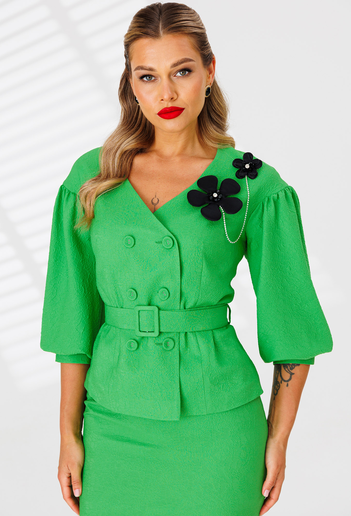 Нарядный костюм, состоящий из жакета и юбки. Жакет полуприлегающего силуэта с двубортной застежкой на петли и пуговицы. Спинка со средним швом и талиевыми вытачками. Перед также с вытачками. Линия плеча спущена. Горловина V-образной формы. Рукава втачные, на манжете, со сборкой в верхней и нижней части. Жакет дополнен съемным поясом с обтянутой пряжкой. Юбка зауженная к низу. Застежка и шлица в среднем шве. Жакет и юбка на подкладке.