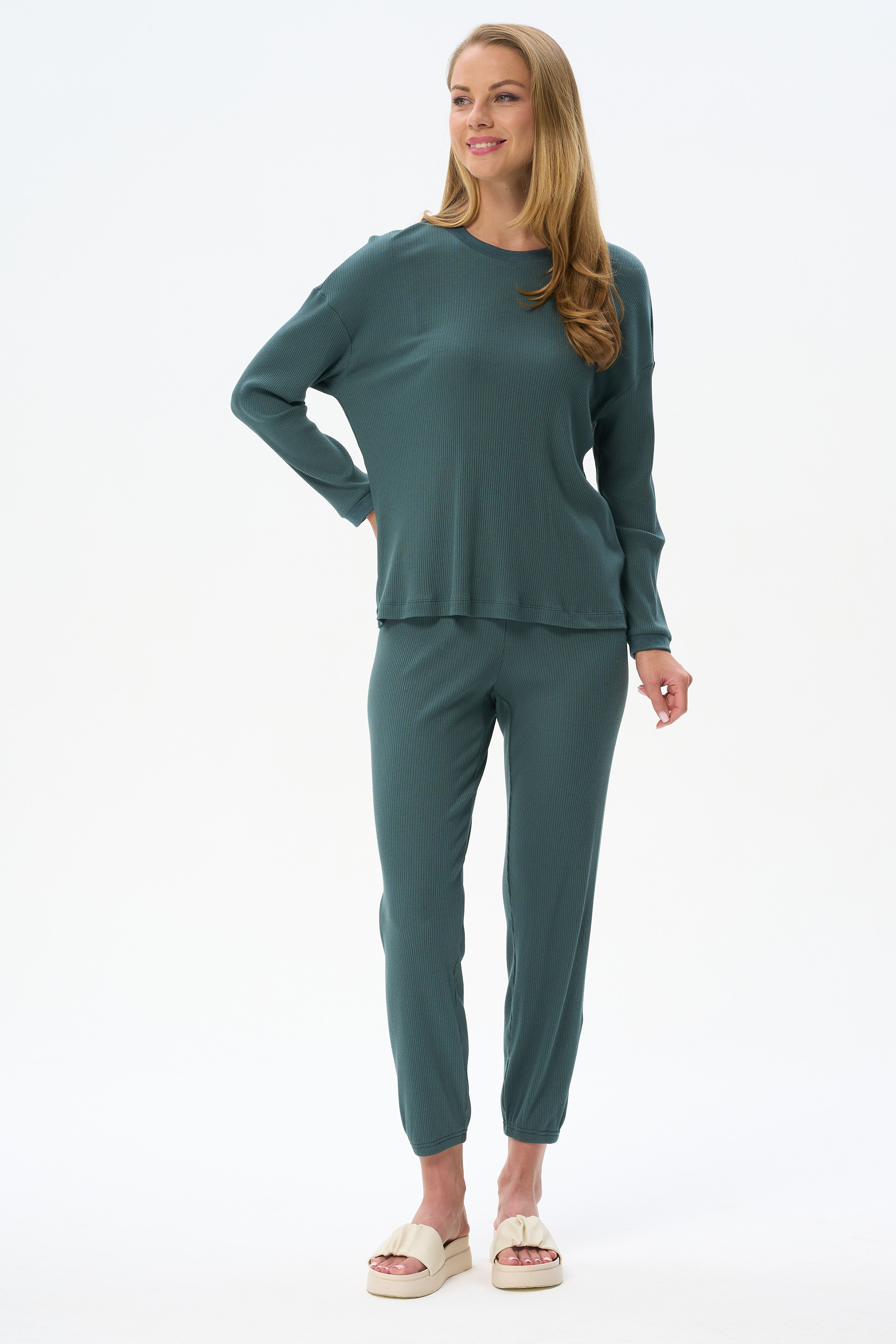 Комплект с брюками из фактурного хлопкового трикотажного полотна с модалом. Джемпер свободного силуэта, круглый вырез горловины, длинные втачные рукава с манжетами. Вырез горловины и манжеты выполнены из хлопкового полотна - рибана. Брюки без бокового шва, с цельнокроенным поясом. По низу цельнокроенные манжеты. Длина брюк по боковому шву в 44 размере - 93,5см. Рост модели на фото 178см.