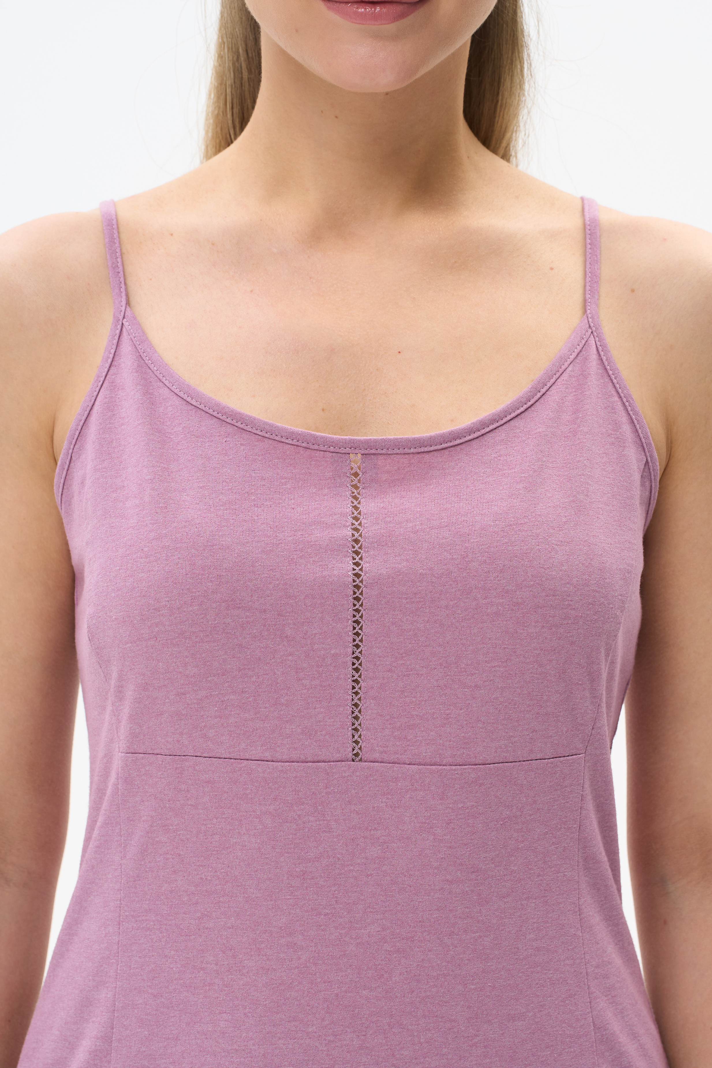 Комплект выполнен из хлопкового меланжевого полотна. Майка с круглым вырезом горловины. Спереди подрез и средний шов декорирован мережкой. Шорты без карманов, пояс с эластичной лентой внутри. Боковые швы шорт декорированы мережкой. Рост модели на фото 178см.