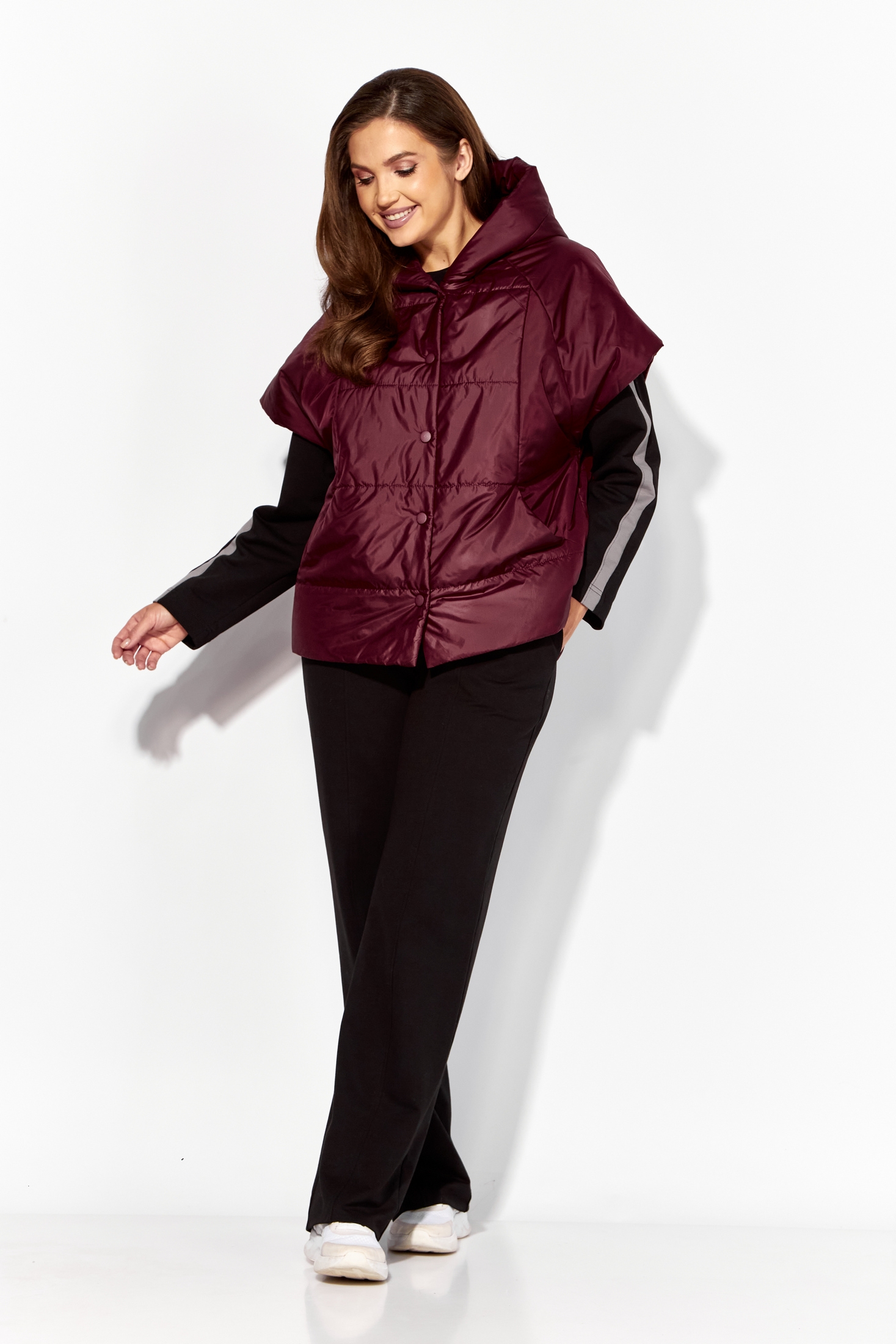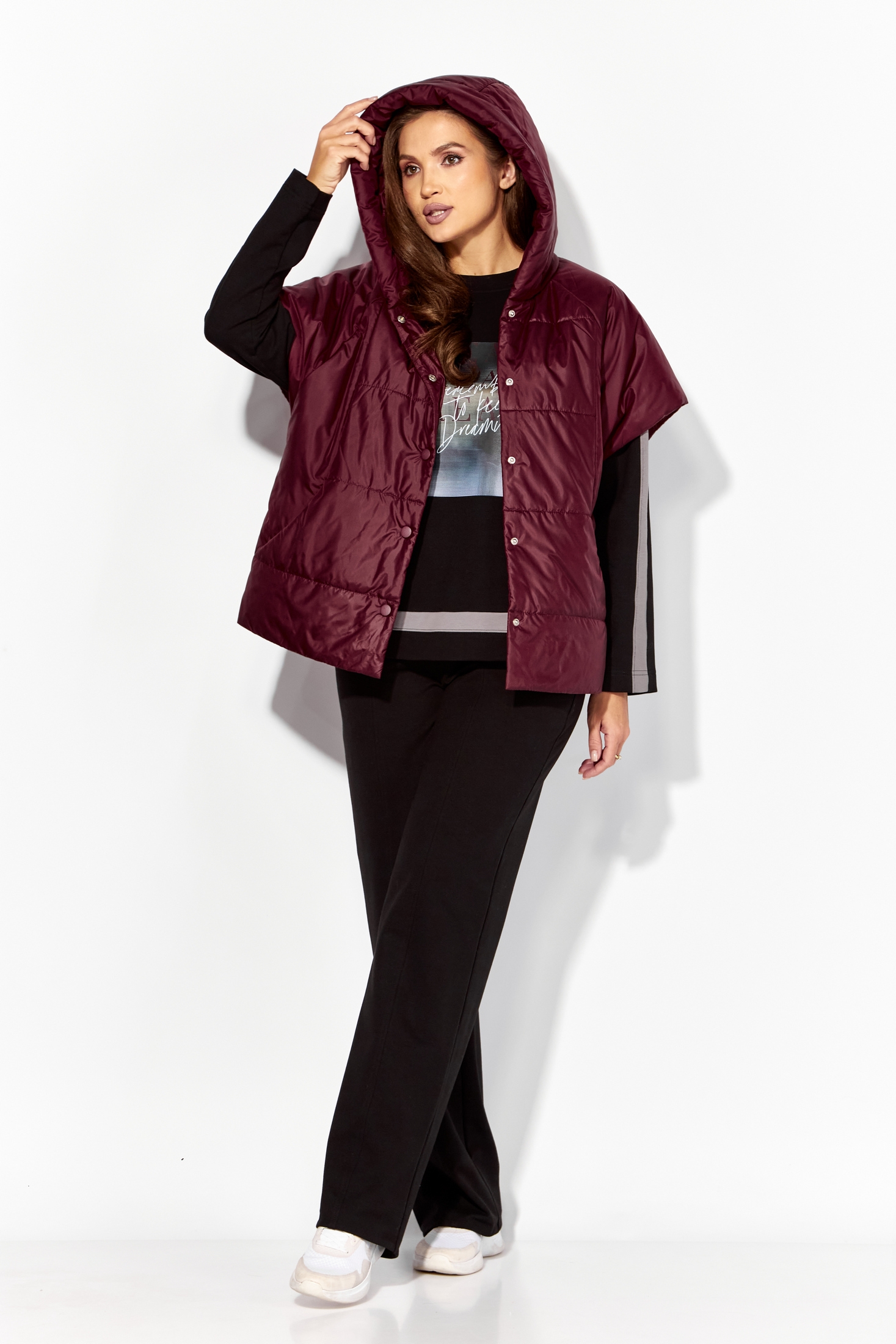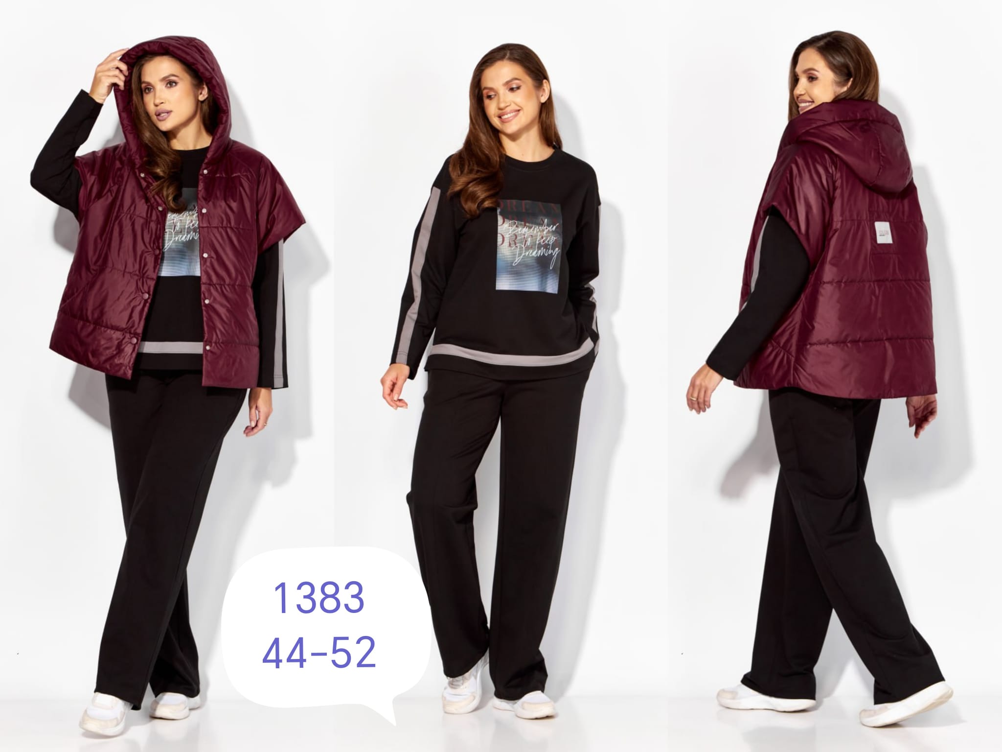 Комплект женский, 3х предметный, состоящий из свитшота, брюк и жилета. Свитшот прямого силуэта с длинным рукавом. Рукав со спущенной линией плеча. Горловина круглой формы с подрезной бейкой. По центру рукавов и низу свитшота вставки(полоски) из полотна контрастного цвета. По бокам разрезы. Перед задекорирован принтом. Брюки прямые, с карманами. Спереди рельефы с отделочными строчками. Пояс притачной, частично на резинке. Жилетка прямого силуэта со спущенным рукавом "реглан" По переду рельефы и карманы в рельефах. Спинка и центральная часть переда простеганы. Застежка центральная, на кнопки. Горловина оформлена капюшоном. Низ жилета, по спинке, слегка удлинён. На спинке декоративная нашивка. Жилет изготовлен из плащевой ткани, на синтепоне(VS-100) и на подкладке