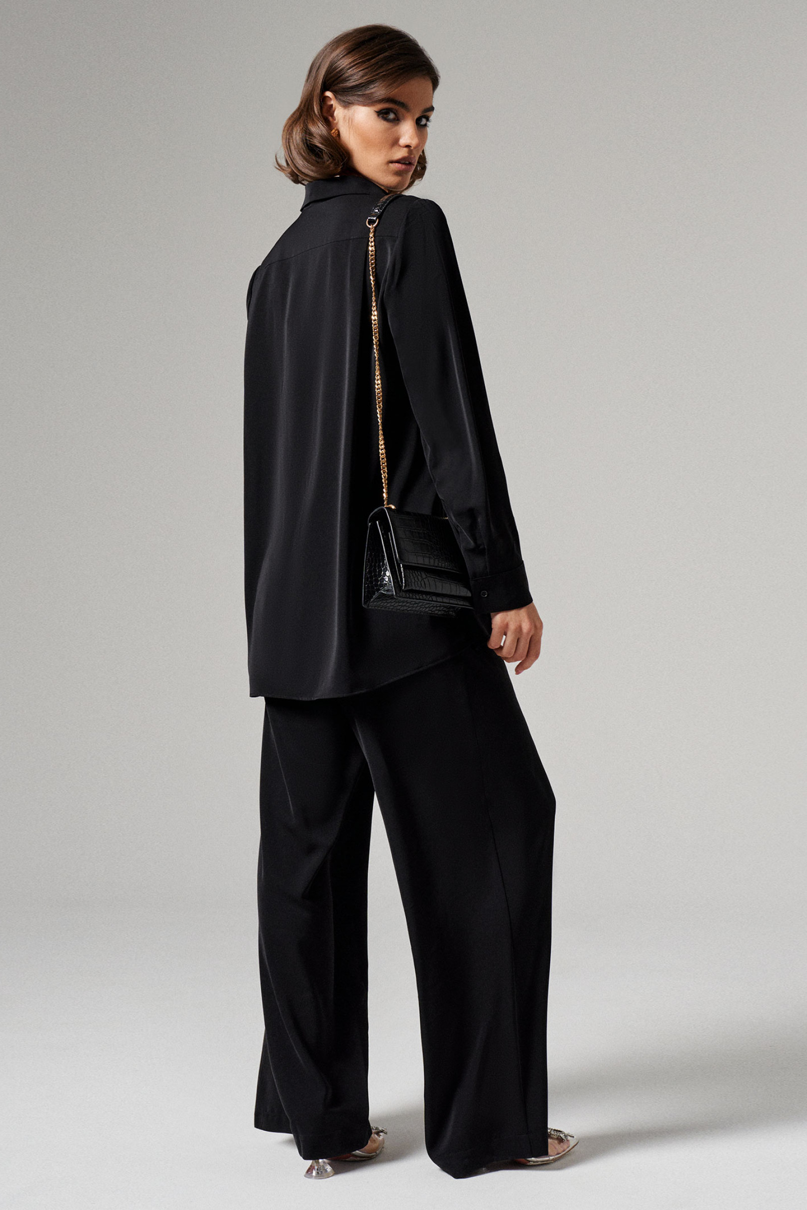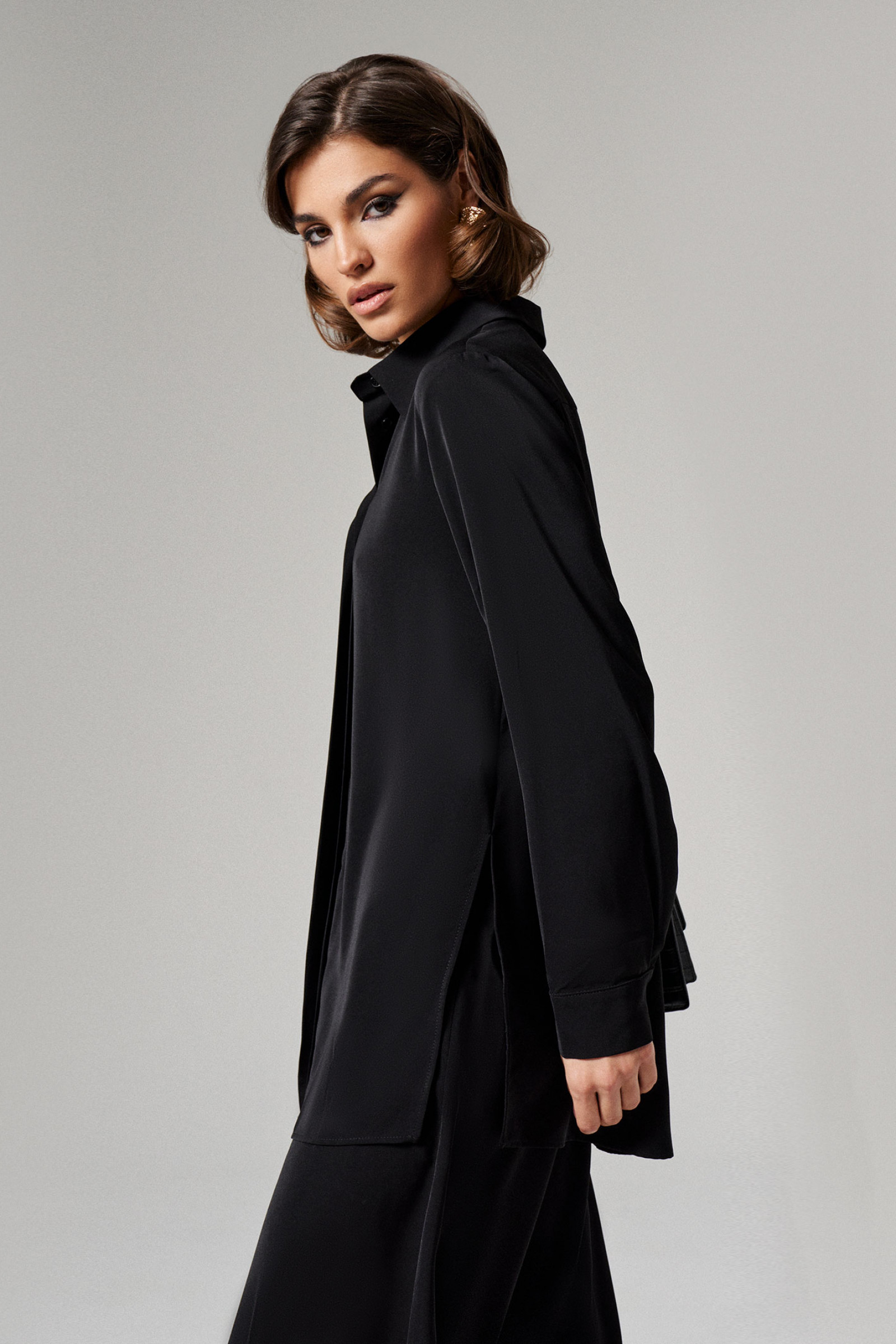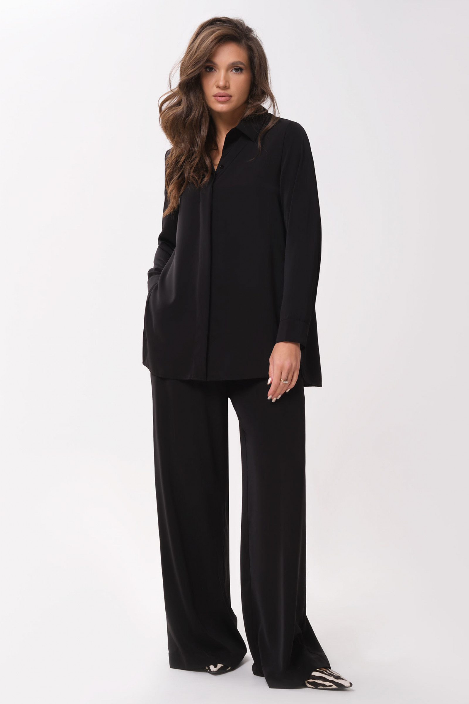 46 Блузка: Длина изделия - 77см, Длина рукава - 61см, Обхват шеи - 45см, Ширина плеча - 13см, Ширина по груди - 54см, Ширина по низу - 60см, Ширина рукава - 19см; Брюки: Высота посадки - 32см, Длина брюк с поясом - 114см, Длина по внутреннему шву - 84см, Ширина брючин сверху - 74см, Обхват брюк по низу - 63см, Ширина по бедрам - 56см, Ширина по талии - 39см;