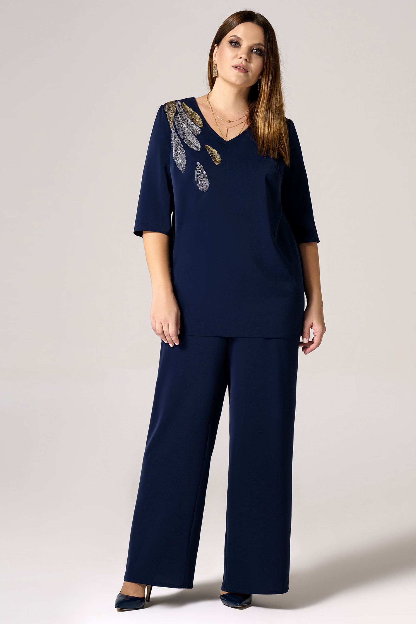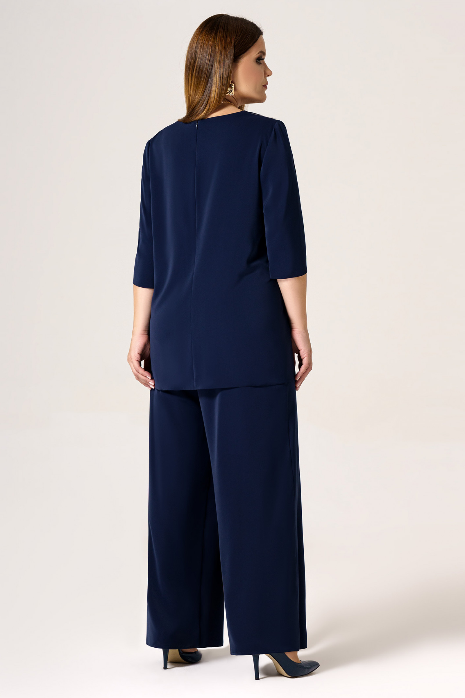 56 Блузка: Длина изделия - 72см, Длина рукава - 39.5см, Ширина плеча - 10.3см, Ширина по бедрам - 68см, Ширина по груди - 62см, Ширина рукава - 21см; Брюки: Высота посадки - 29.5см, Длина брюк без пояса - 103.5см, Длина по внутреннему шву - 780.5см, Ширина брючин сверху - 85см, Обхват брюк по низу - 59.5см, Ширина по бедрам - 66см, Ширина по талии - 46см;