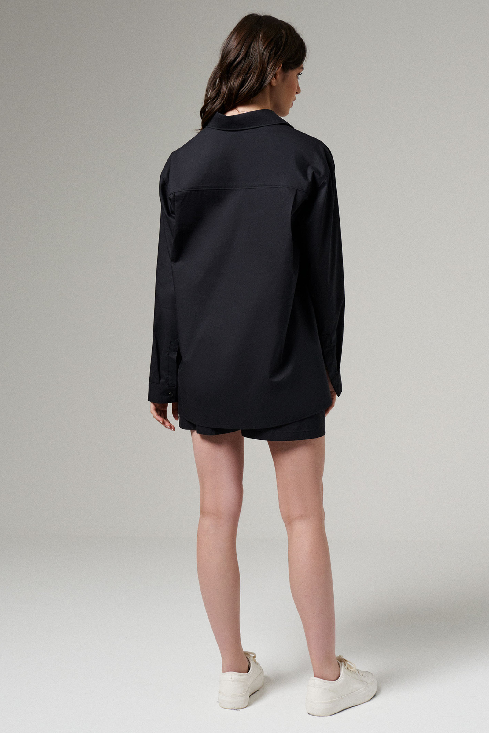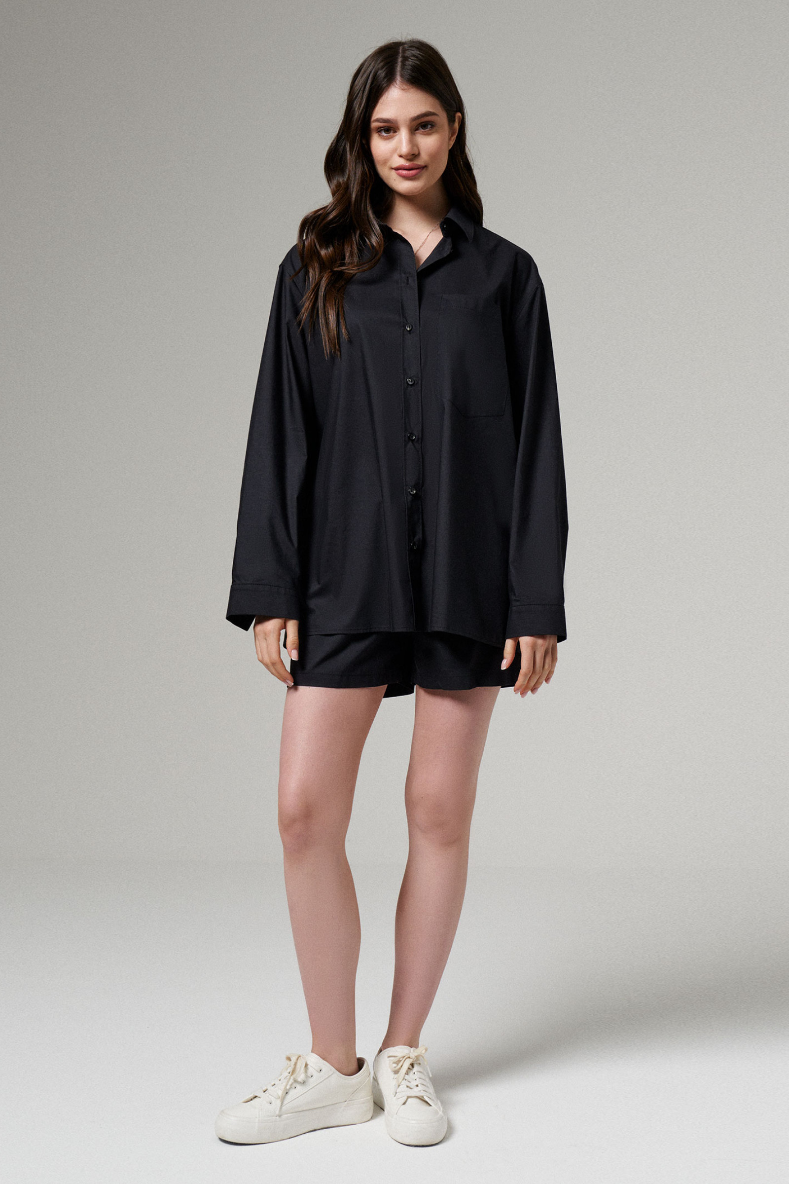 Комплект женский из хлопковой ткани для повседневной носки. Комплект состоит из шорт и блузы. Блуза свободная прямого кроя с фронтальной бортовой застежкой на пуговицы и воротником- стойкой. По переду блузы накладной карман. По спинке отрезная кокетка. Рукав длинный оформлен притачной манжетой. Шорты свободные, на резинке, что очень удобно. Шорты длиной выше колена. Отличный вариант для жарких дней.