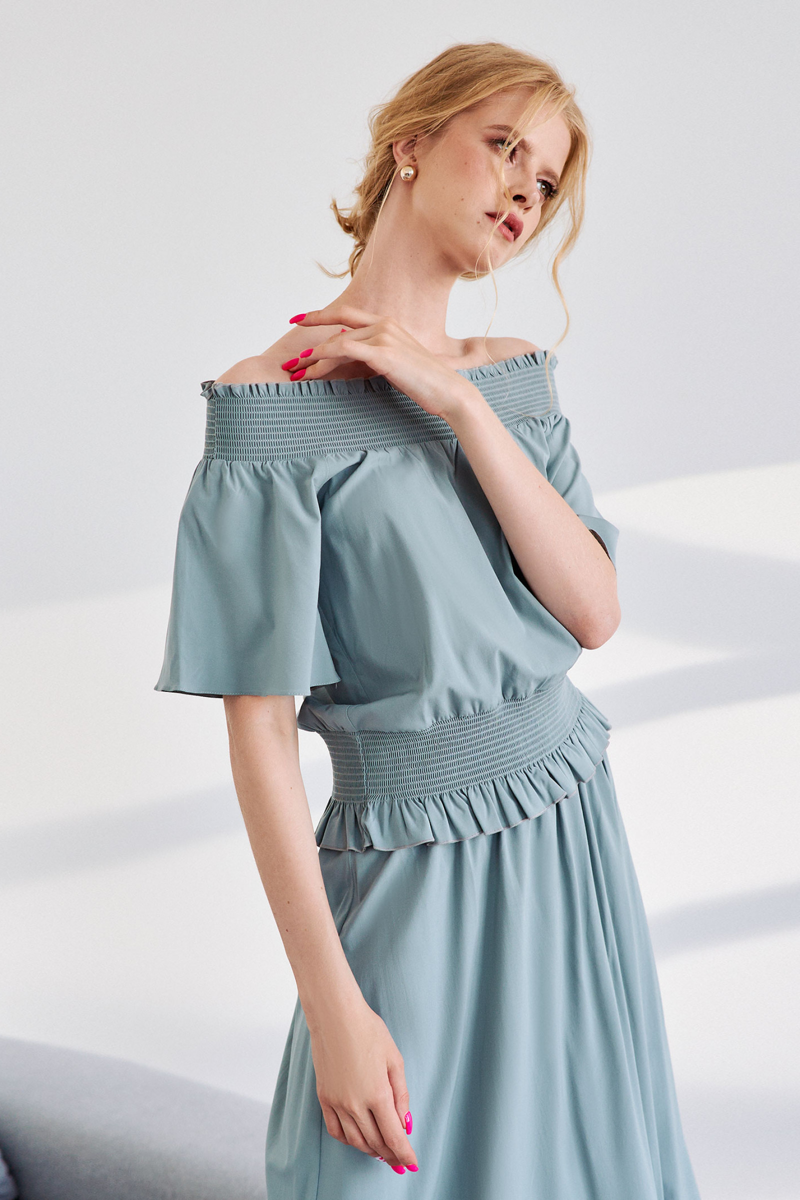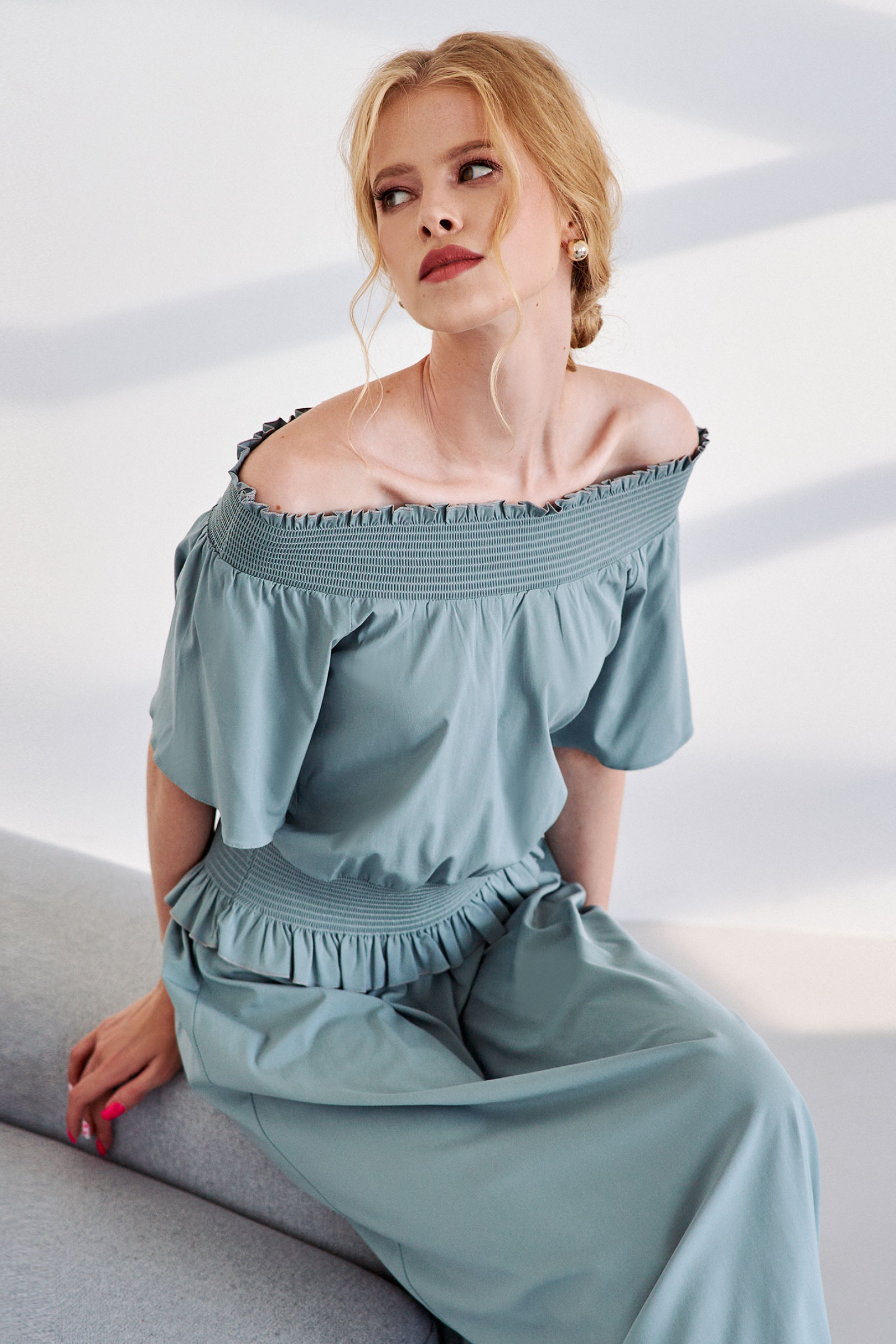 Комплект летний из блузы и длинной юбки решит извечную проблему с гармоничным сочетанием верха и низа. Женский костюм выполнен из вискозы, он легкий и струящийся. В нем можно отправиться на прогулку, в офис, на встречу или торжество. Блузка женская с рукавом-крылышком украшена по линии талии широкой резинкой. Аналогичная резинка проходит и по линии плеч, оголяя их. Блуза и длинная юбка, спадающая мягкими волнами, идеально сочетаются между собой. Вы можете купить костюм с юбкой праздничный в размере 42-48.