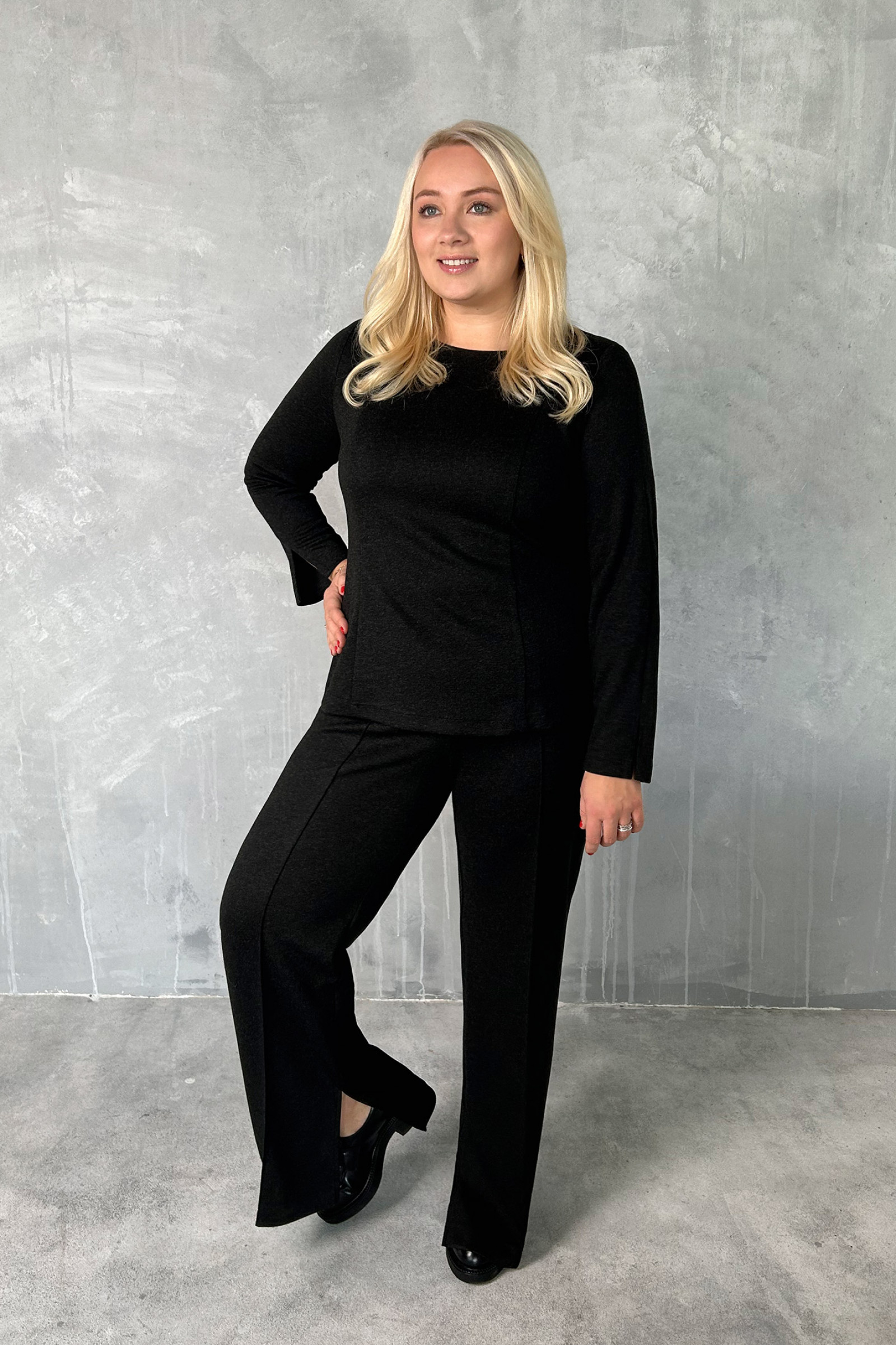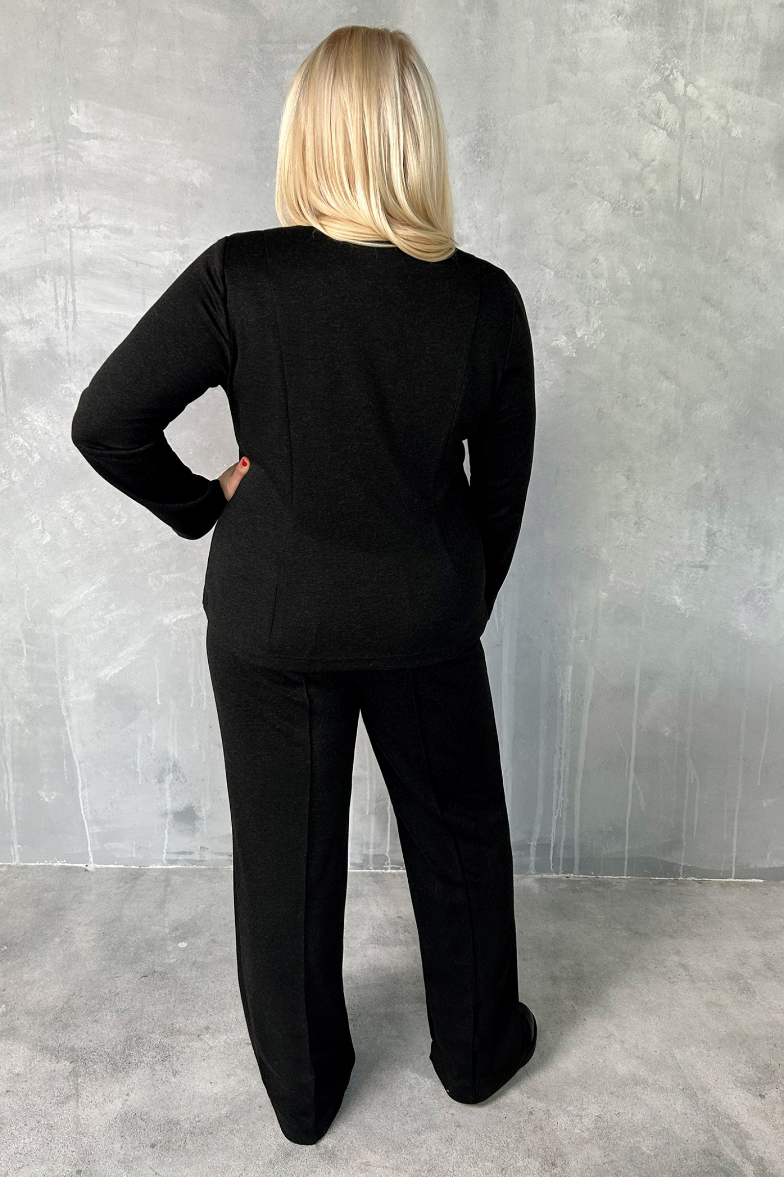 56 Джемпер: Длина изделия - 65см, Длина рукава - 62см, Ширина плеча - 10.5см, Ширина по груди - 59см, Ширина по низу - 64см, Ширина рукава - 20см; Брюки: Высота посадки - 33см, Длина брюк с поясом - 113см, Длина по внутреннему шву - 85см, Ширина брючин сверху - 80см, Ширина брючин по низу - 63см, Ширина по бедрам - 64см, Ширина по талии - 46.5см;
