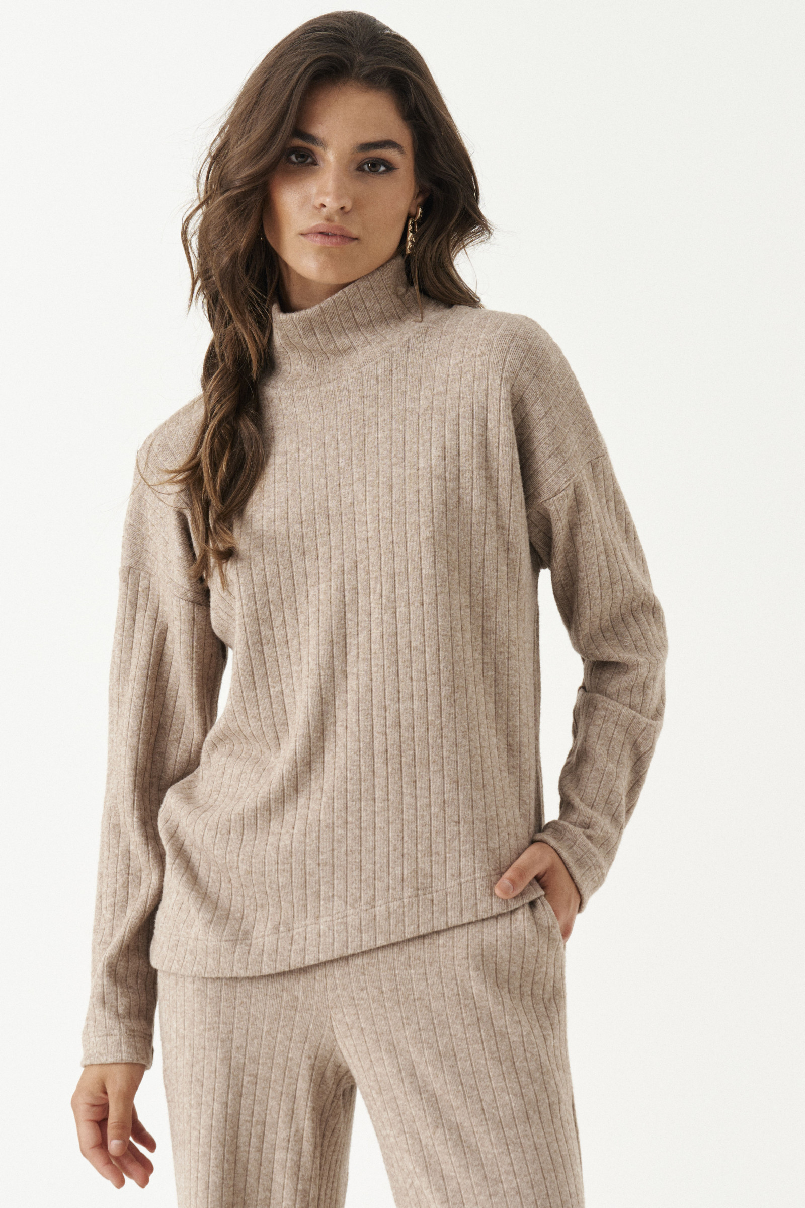 Комплект женский из смесовой ткани для повседневной носки. Комплект состоит из джемпера и брюк. Джемпер прямого силуэта. По переду низ изделия идет по косой. Спинка по низу изделия прямая. Горловина обработана воротником-стойкой. Линия плеча спущенная. Рукава втачные, длинные. Брюки классической длины прямые с посадкой на талии. Верхний срез брюк обработан притачным поясом на резинке. Стильный и красивый комплект осчастливит вас своим изящным видом.