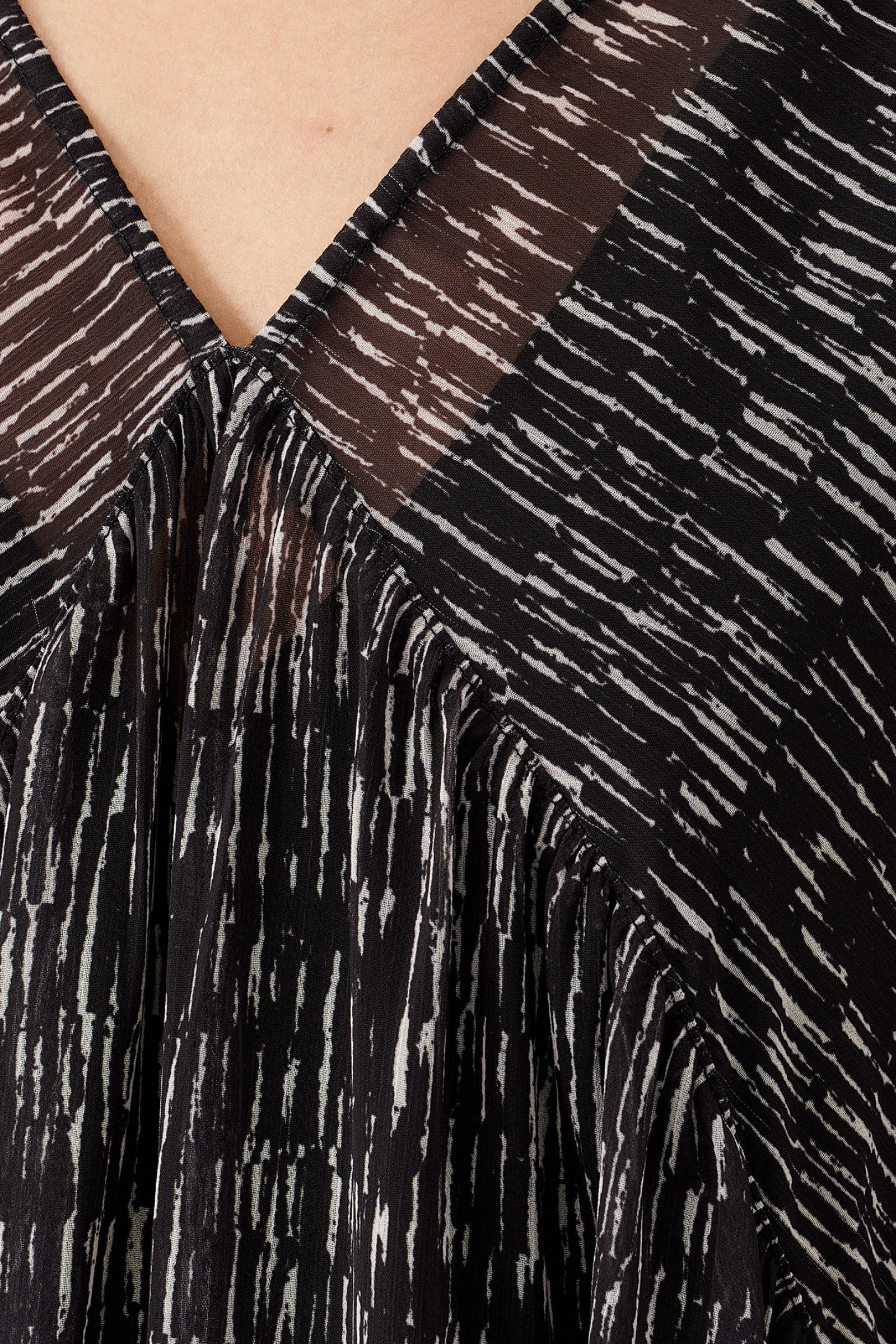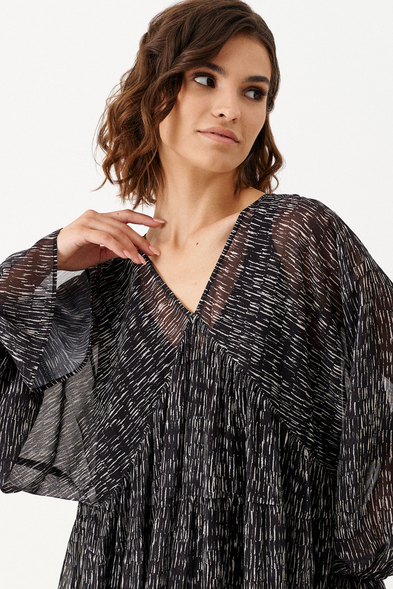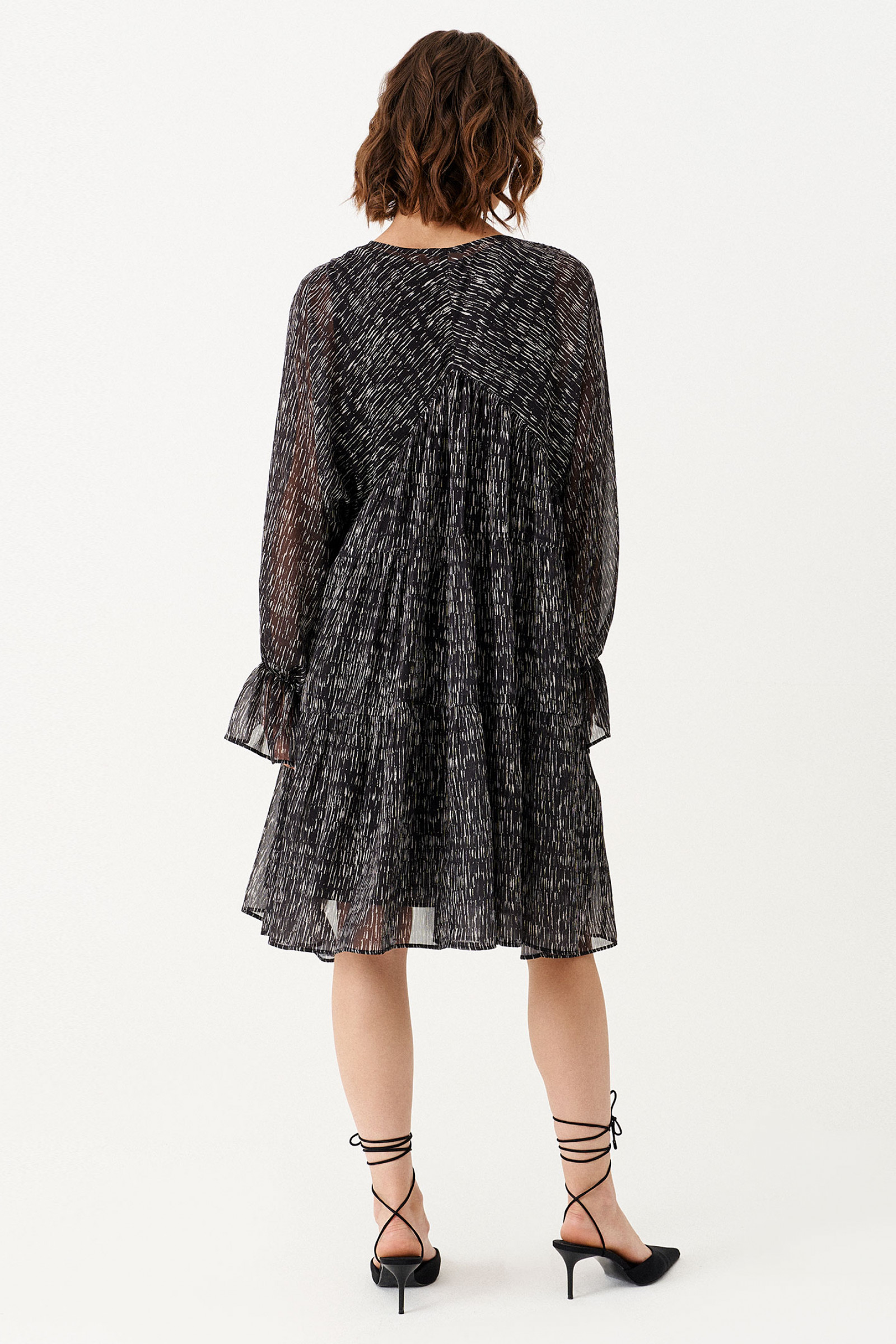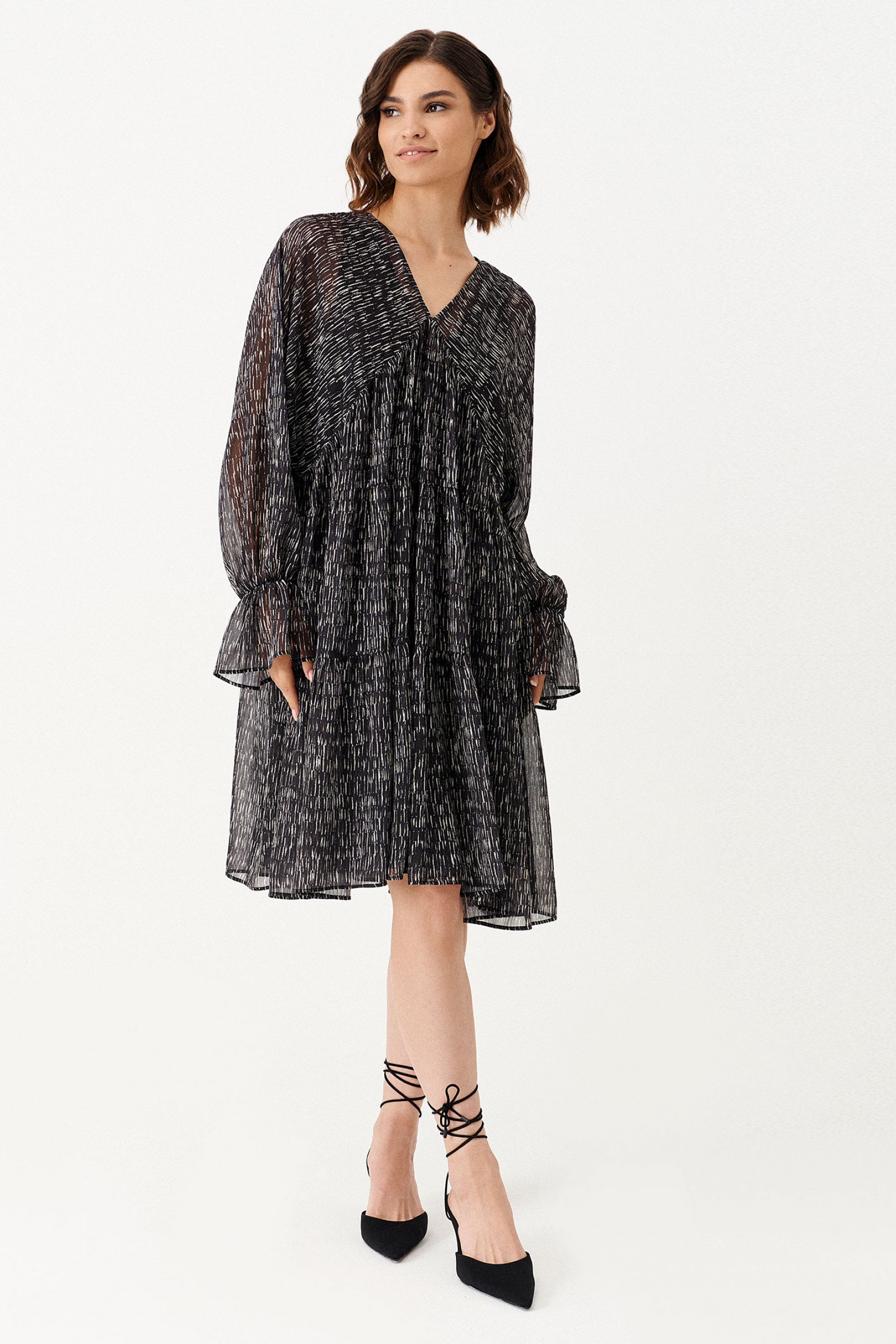 Платье из струящейся ткани для повседневной носки. Изделие укомплектовано нижним платьем из вискозной ткани. Рукав длиннный реглан. Длина изделия до колена. Изделие с тремя отрезными ярусами на сборке.