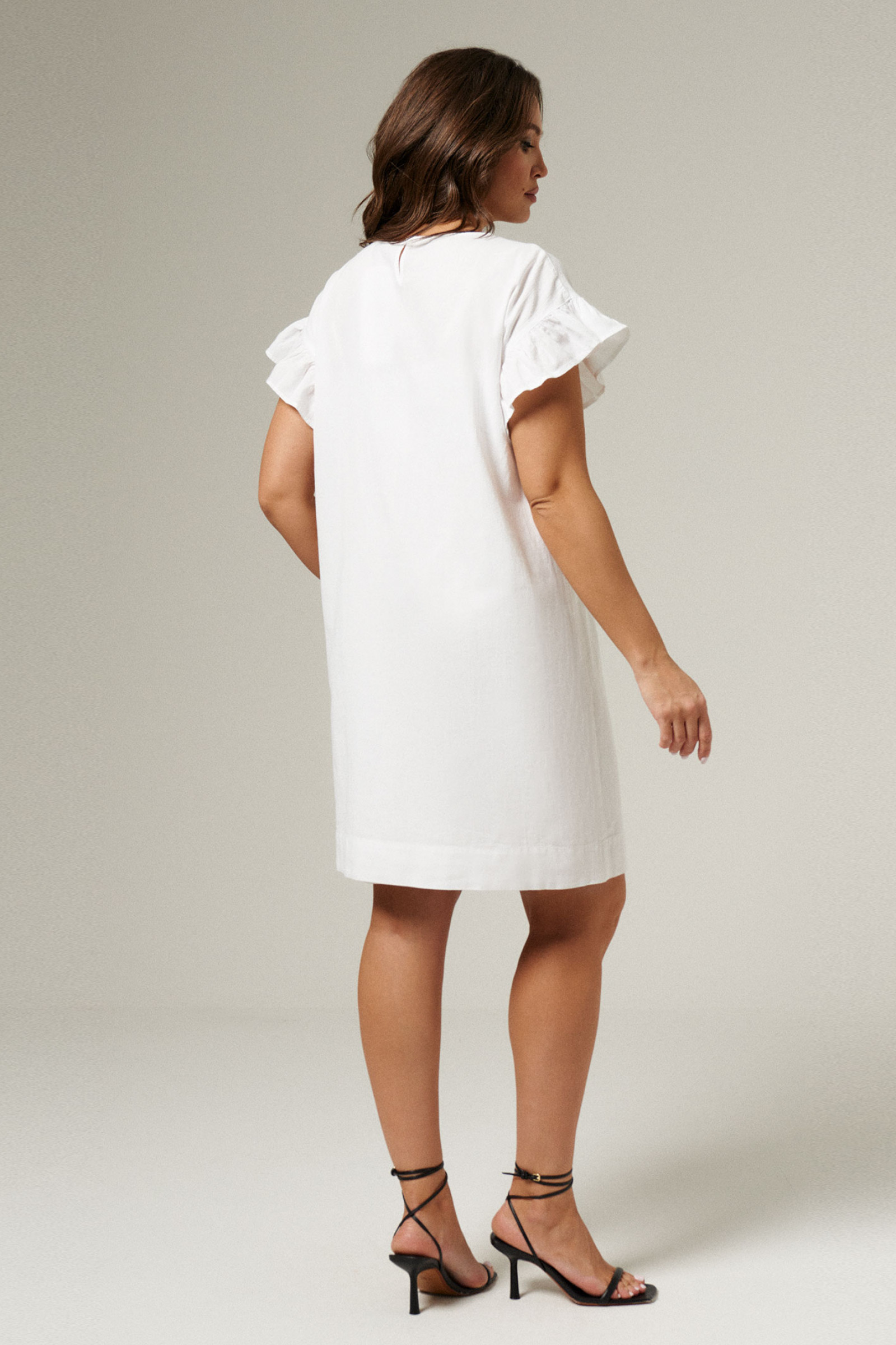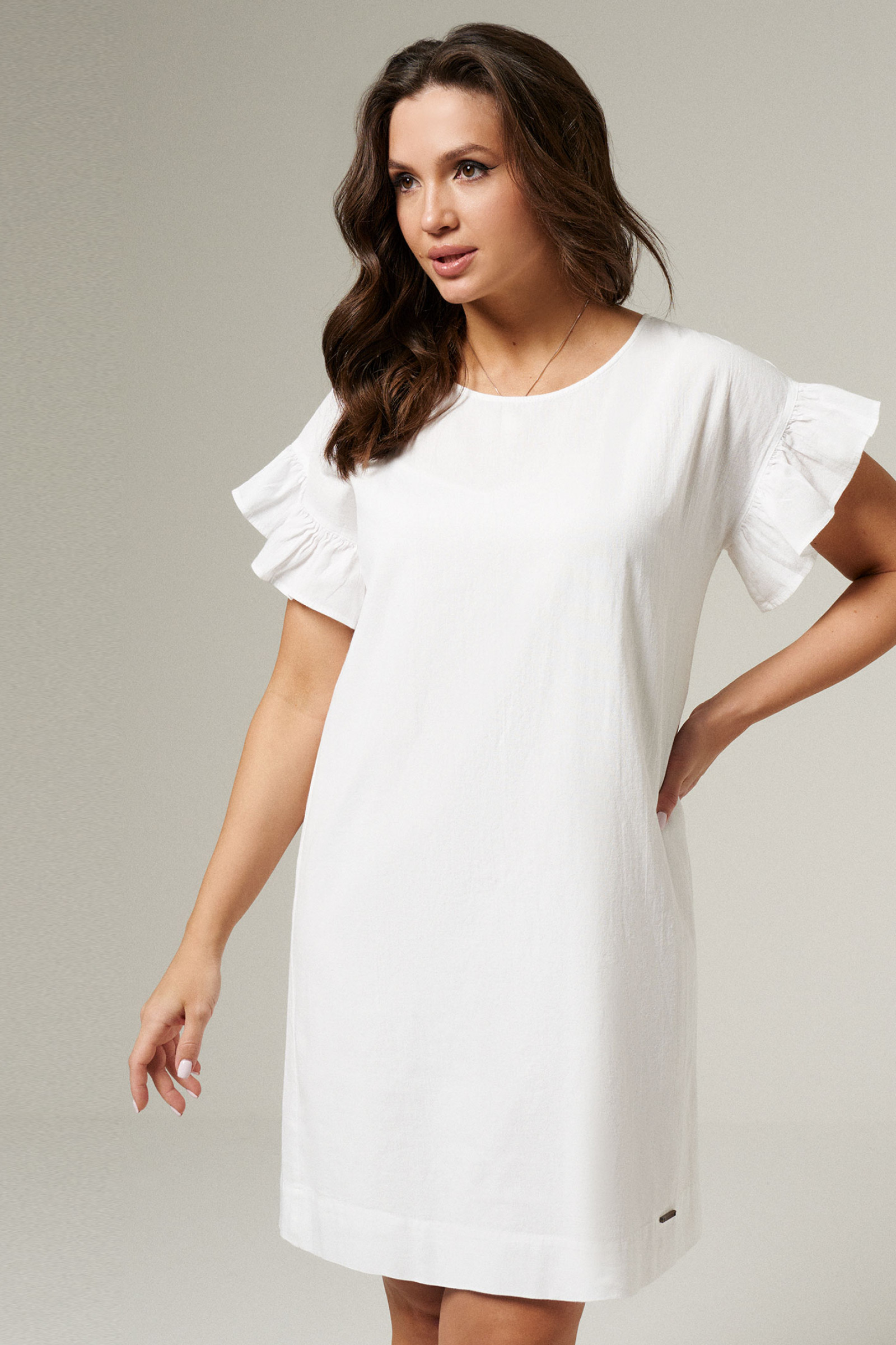 Платье из хлопковой ткани для повседневной носки. Изделие прямого силуэта с коротким цельнокроеным рукавом оформленым притачной рюшей. Платье длиной до колена. Изделие укомплектовано нижним платьем из вискозной ткани.