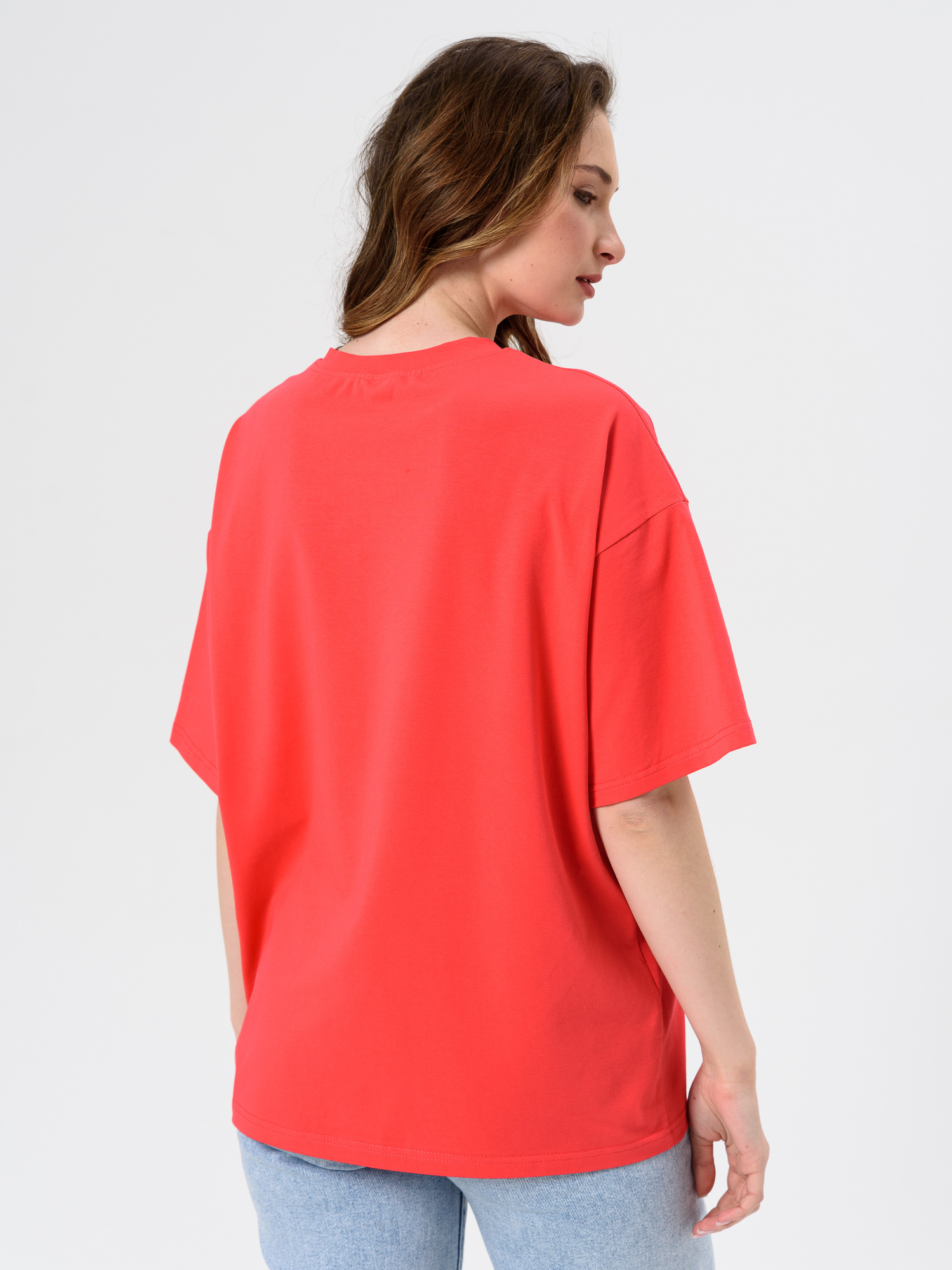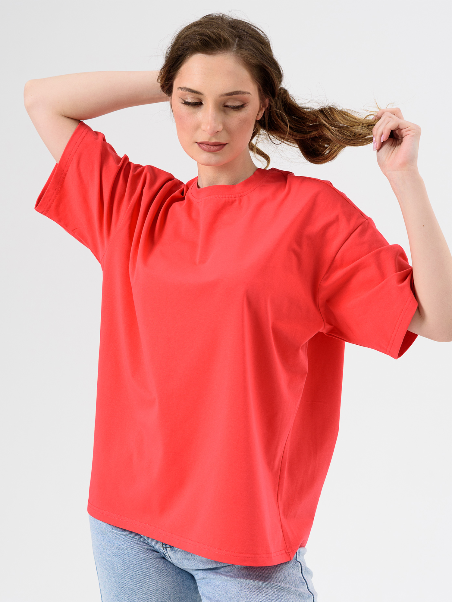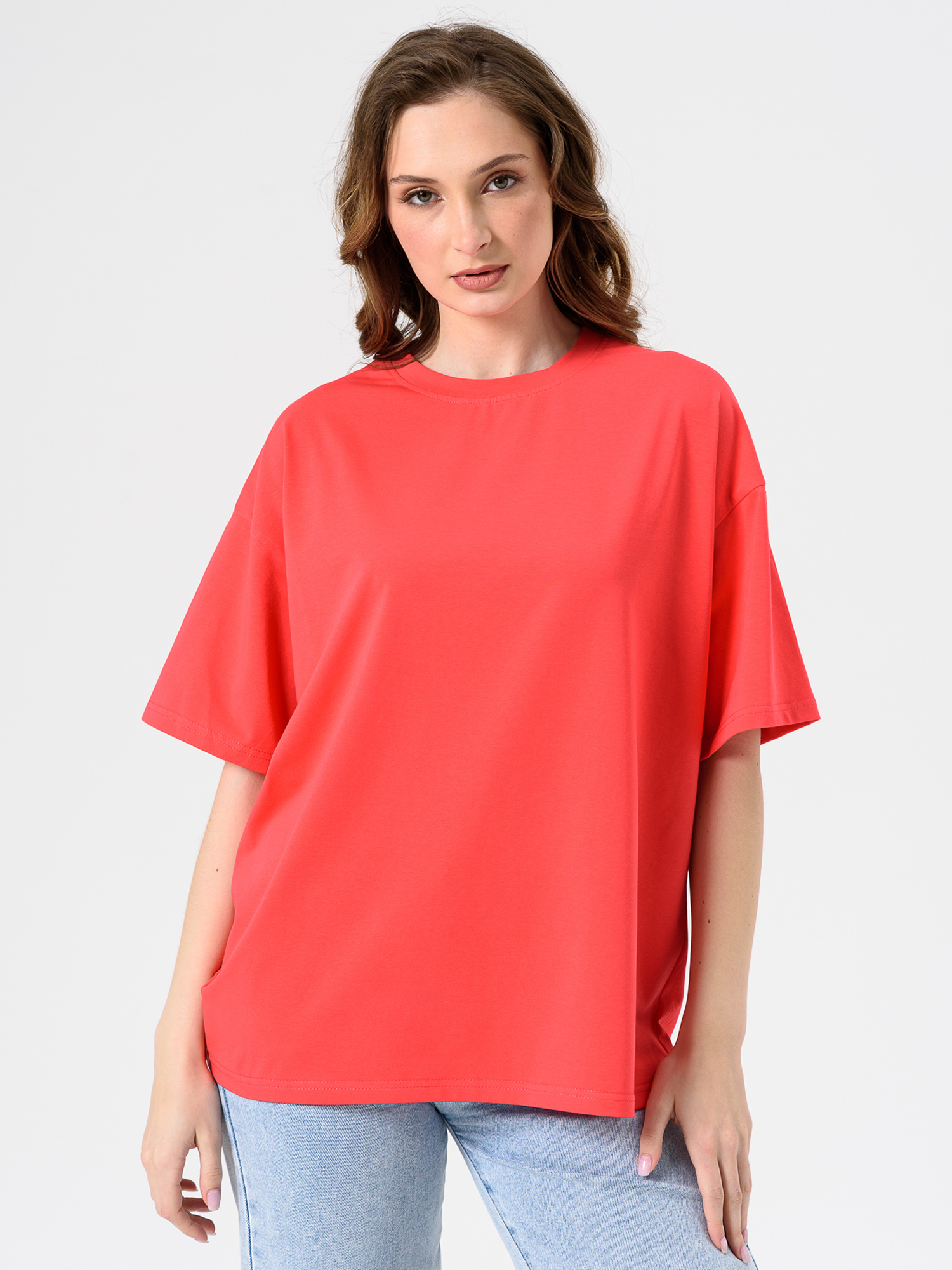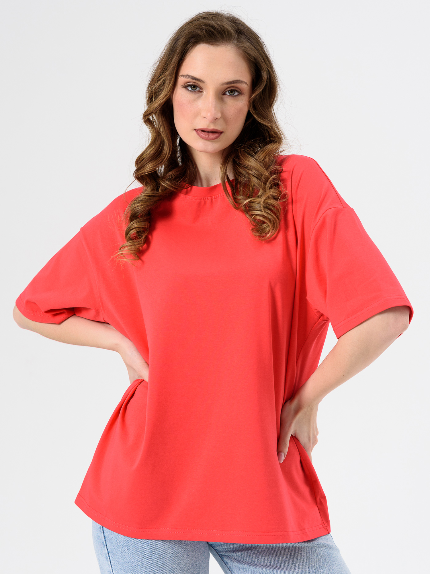 Футболка женская свободной формы, из гладкокрашенного трикотажного х/б полотна с лайкрой, в стиле «Oversize». Круглая горловина. Спущенную линию плеча, продолжает втачной рукав, до линии локтя.