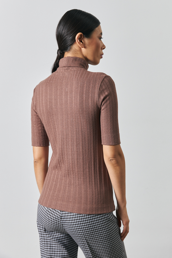 Джемпер прилегающего силуэта из фактурного эластичного полотна. Втачной короткий рукав. Вырез горловины высокая стойка. Джемпер – это хорошая базовая вещь, подходящая для любого гардероба.