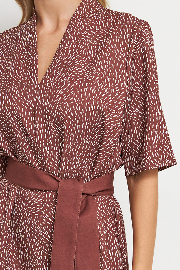 Платье свободного силуэта из плательной ткани. По центру передней части изделия выполнен шов. Цельнокроеная стойка, переходящая в V-образный вырез горловины, визуально делает фигуру стройнее. Втачной короткий рукав.