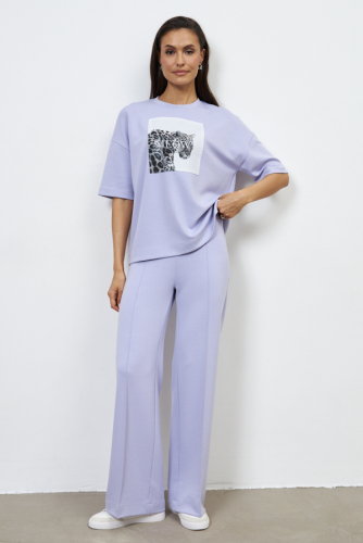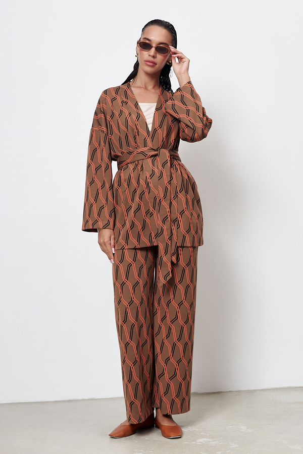 Костюм из эластичного полотна. Брюки прямого силуэта. Пояс притачной с эластичной резиной. Кардиган свободного силуэта с притачной планкой. Втачной широкий рукав в спущенную пройму. В комплекте пояс из основной ткани.